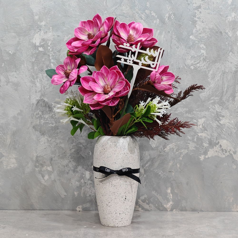 باقة تحتوي على زهور الأمارولس الوردية الصناعية، مرتبة بشكل جميل في فازة.