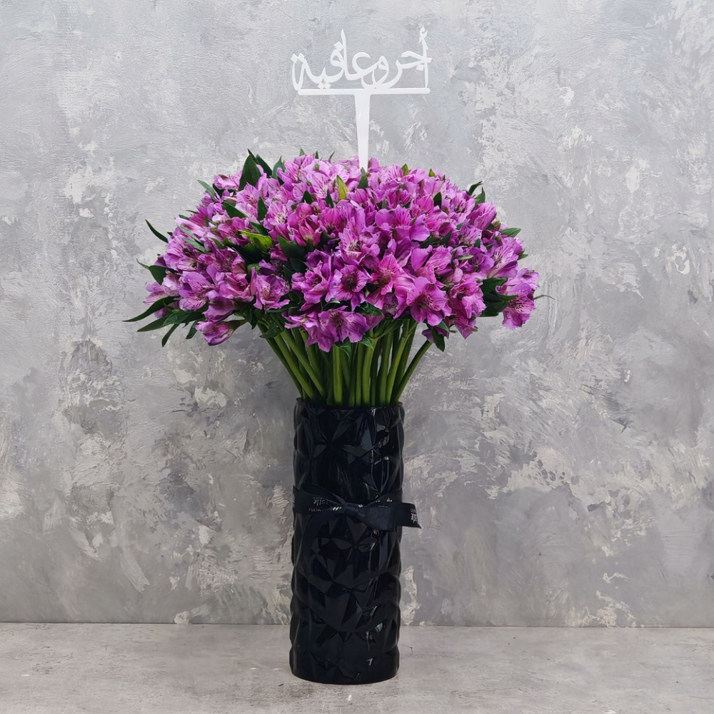 فاز حجر يحتوي زهور الستروميريا وردي.