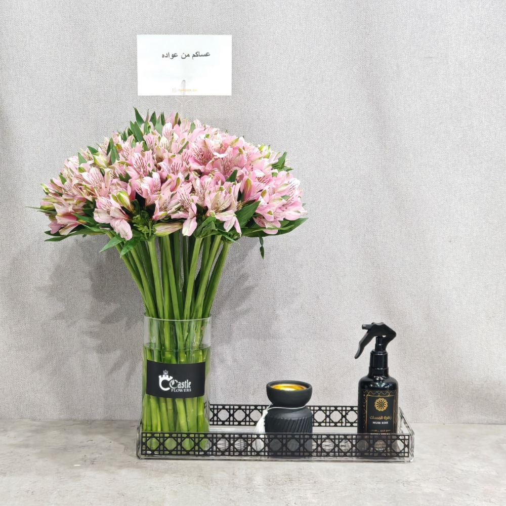 باقة تحتوي على زهور الألستروميريا الوردية، مرتبة بشكل جميل في صينية. تأتي مع مبخر ومرش.