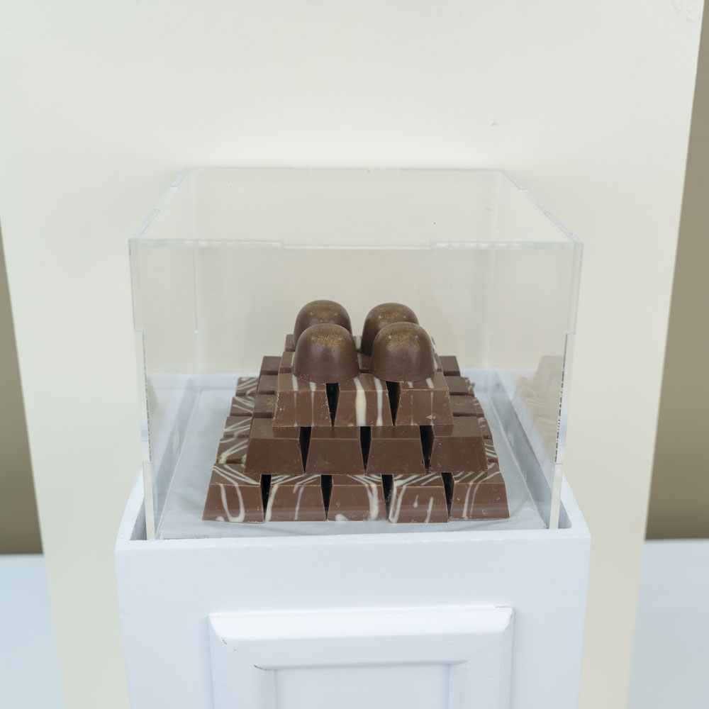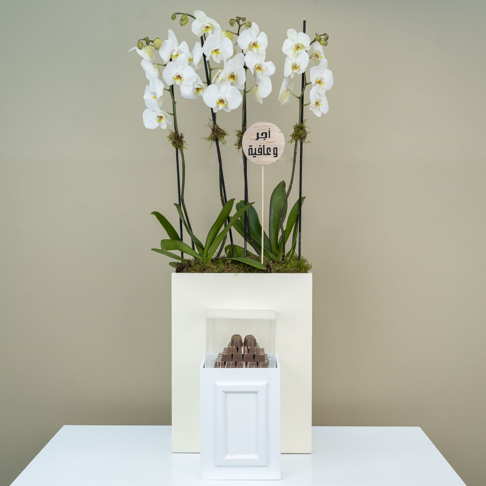 هذه الباقة تحتوي على نباتات الأوركيد مع الشوكولاتة.