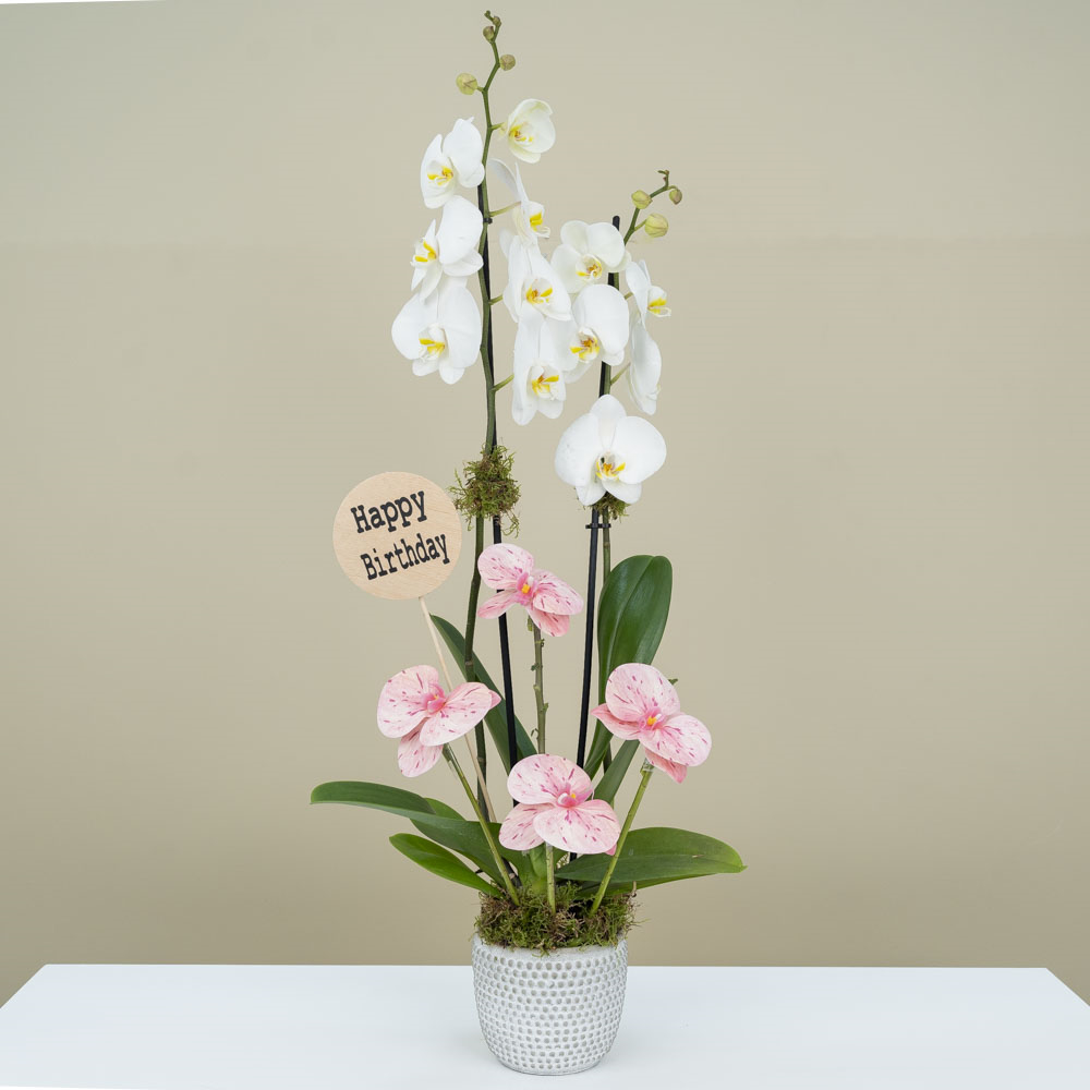 هذه الباقه تحتوي على الاوركيد بلانت وزهور صناعية.