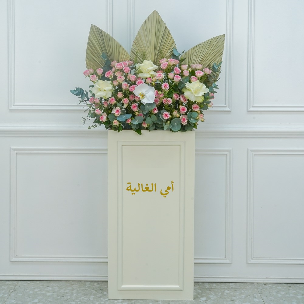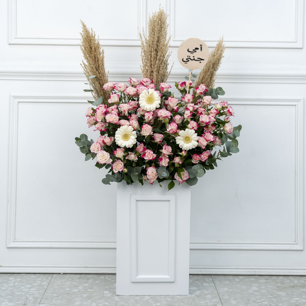 هذه الباقة تحتوي على الجوري، البيبي جوري والكرنيشن مع الشوكولاتة.