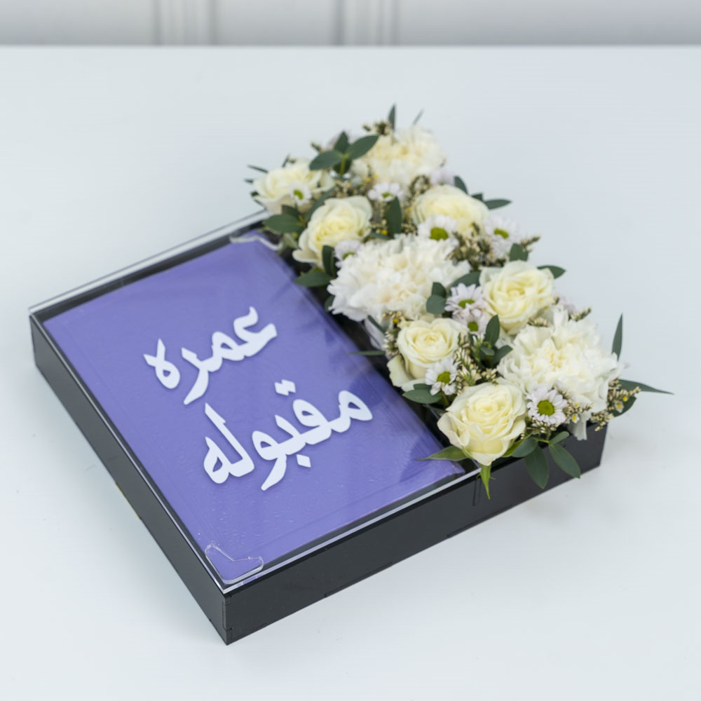 صينية أكريليك مزينة بزهور البيبي جوري والكارنيشن مع كتاب القرآن الكريم.
