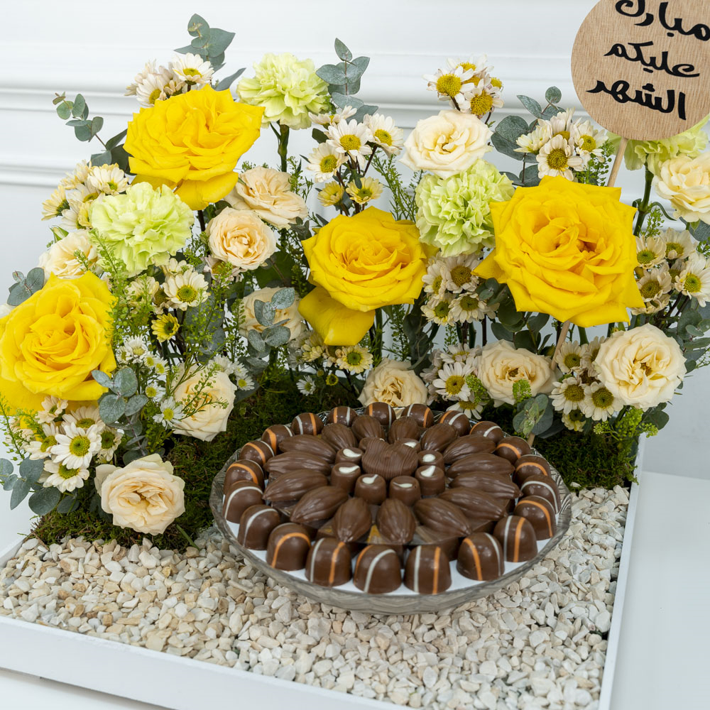 صينية خشبية فخمة مزينة زهور الجوري، البيبي جوري والكارنيشن، تأتي مع الشوكولاتة البلجيكية متعددة الحشوات.