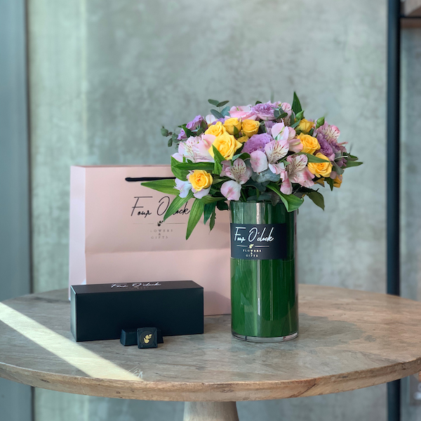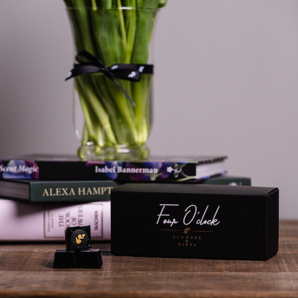 فازة تحتوي على توليب مع علبة شوكولاتة.