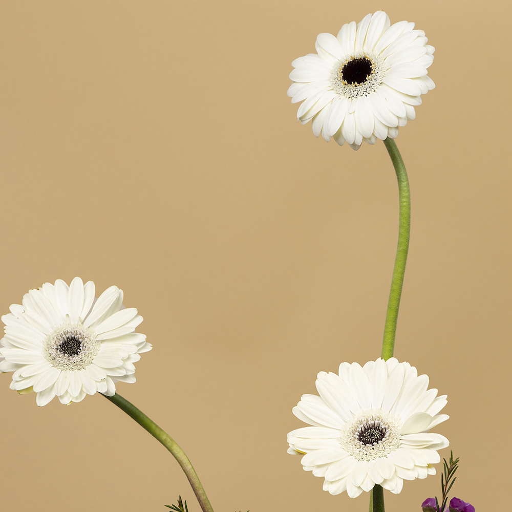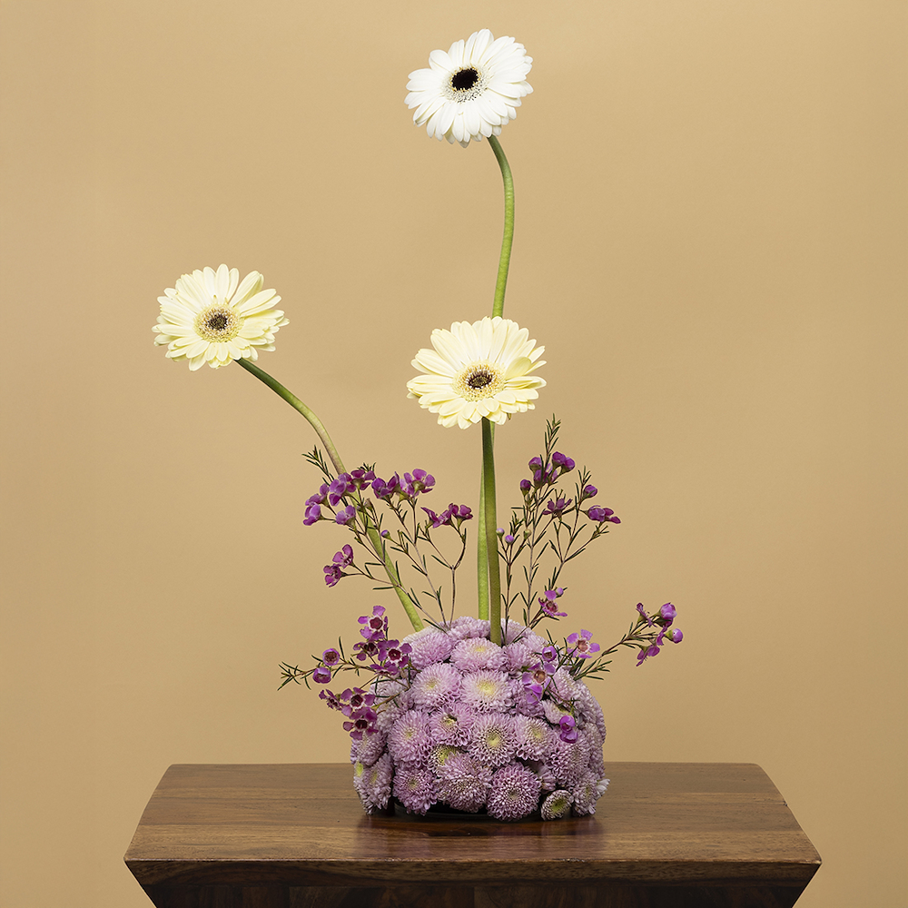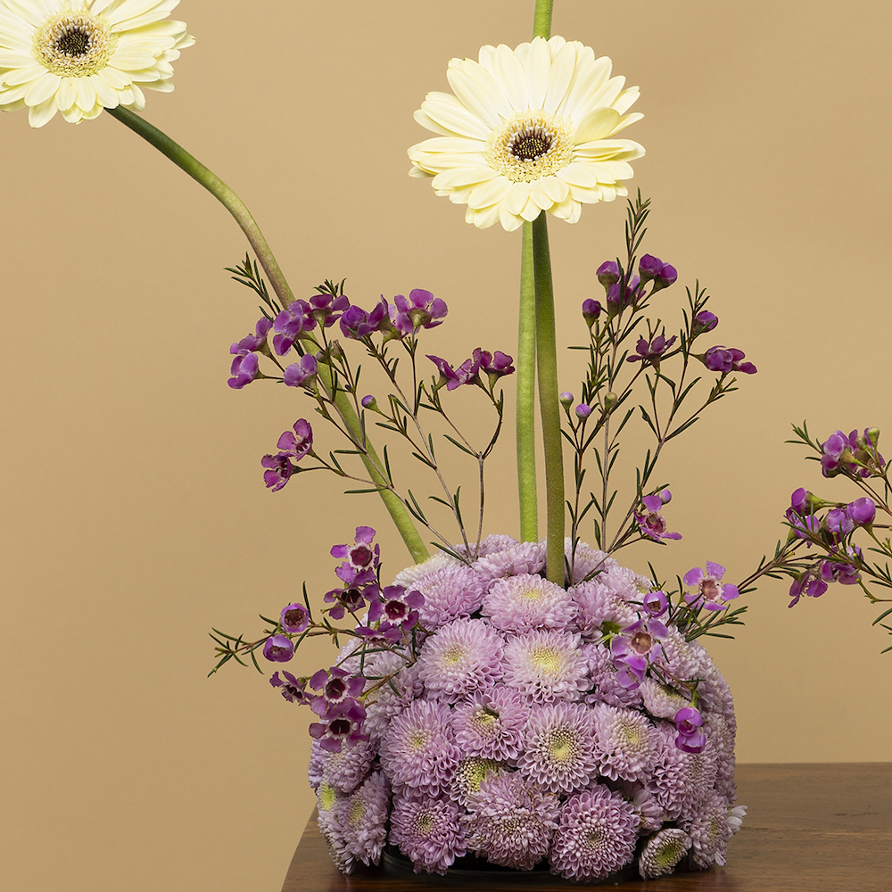 تنسيق يحتوي على الجيربيرا، زهور الواكس وزهور الكريز.