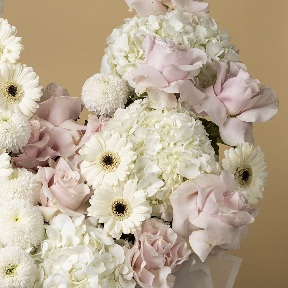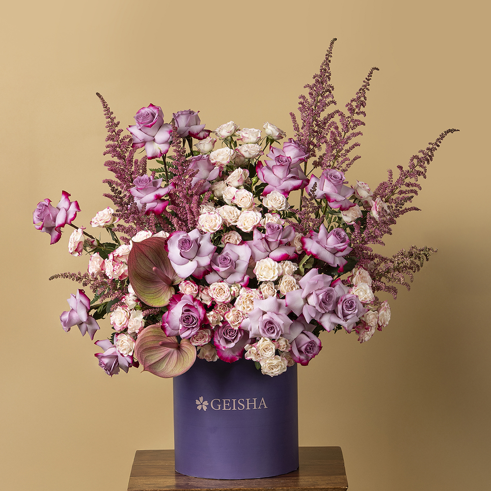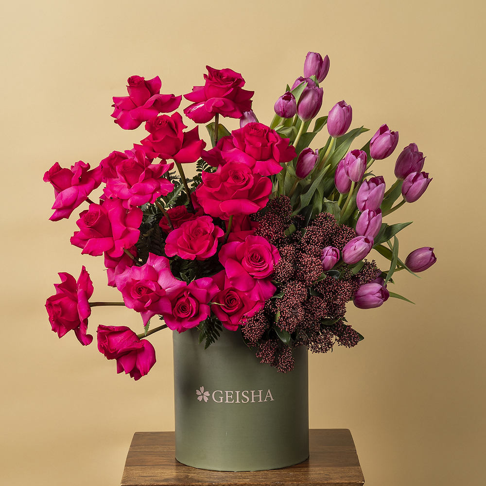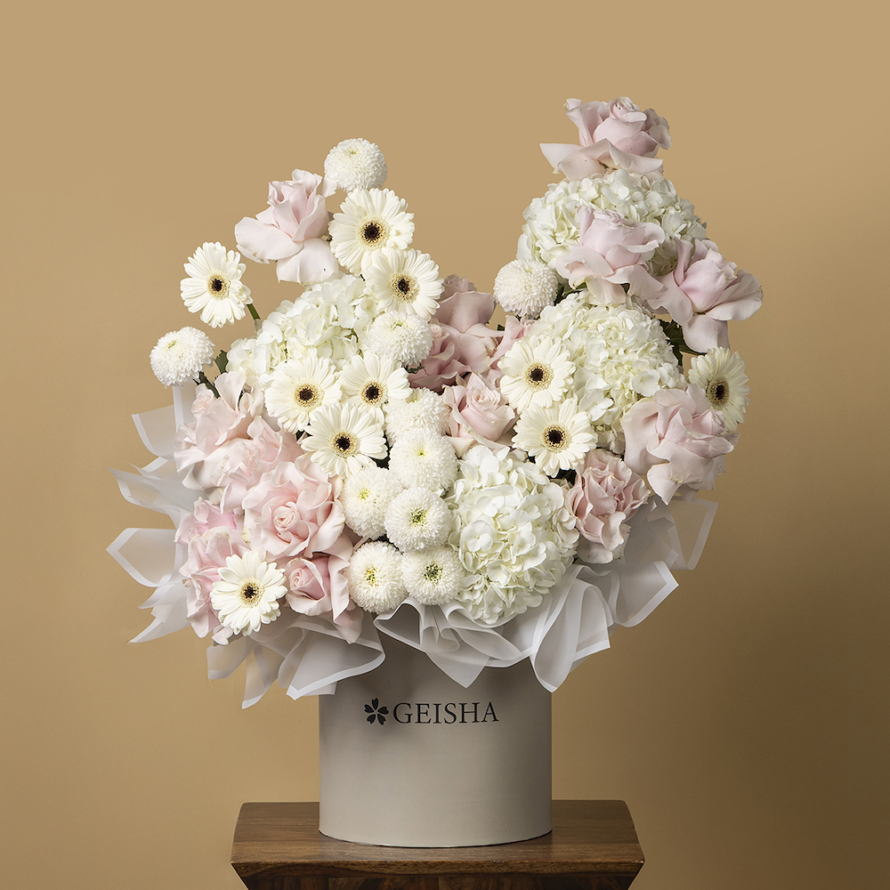صندوق يحتوي على الجوري، الجيربيرا، الهايدرنجا وزهور الكريز.