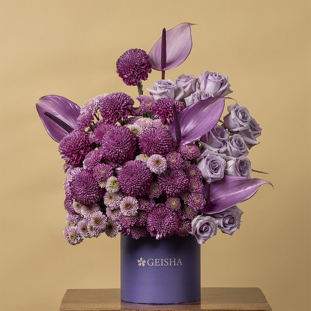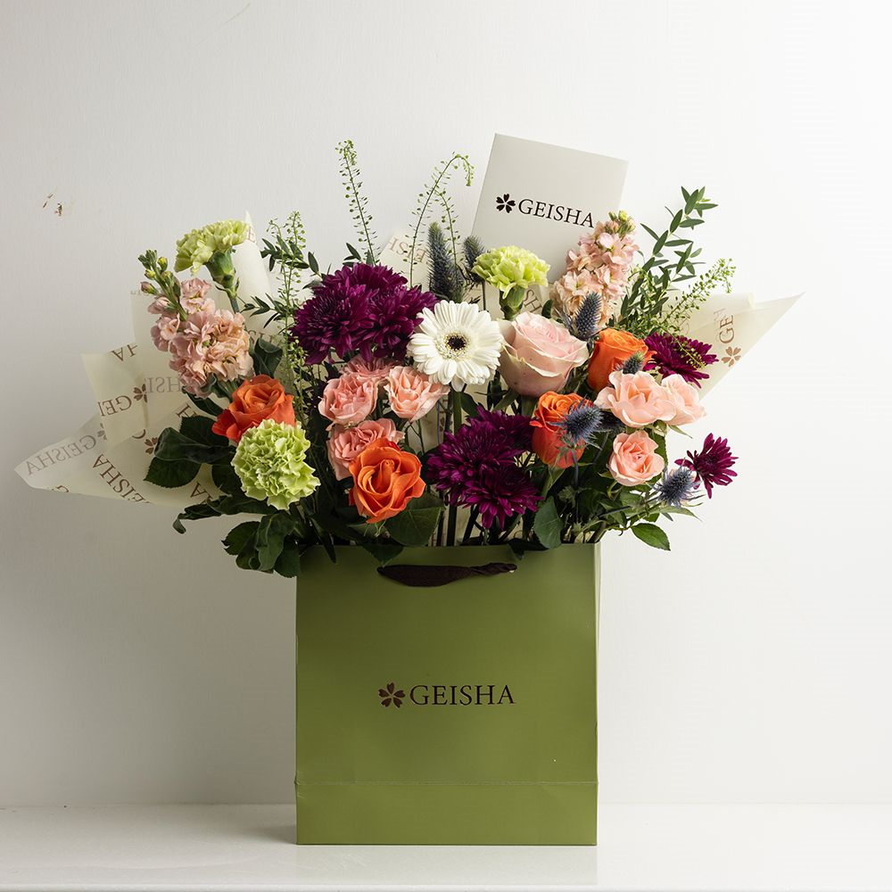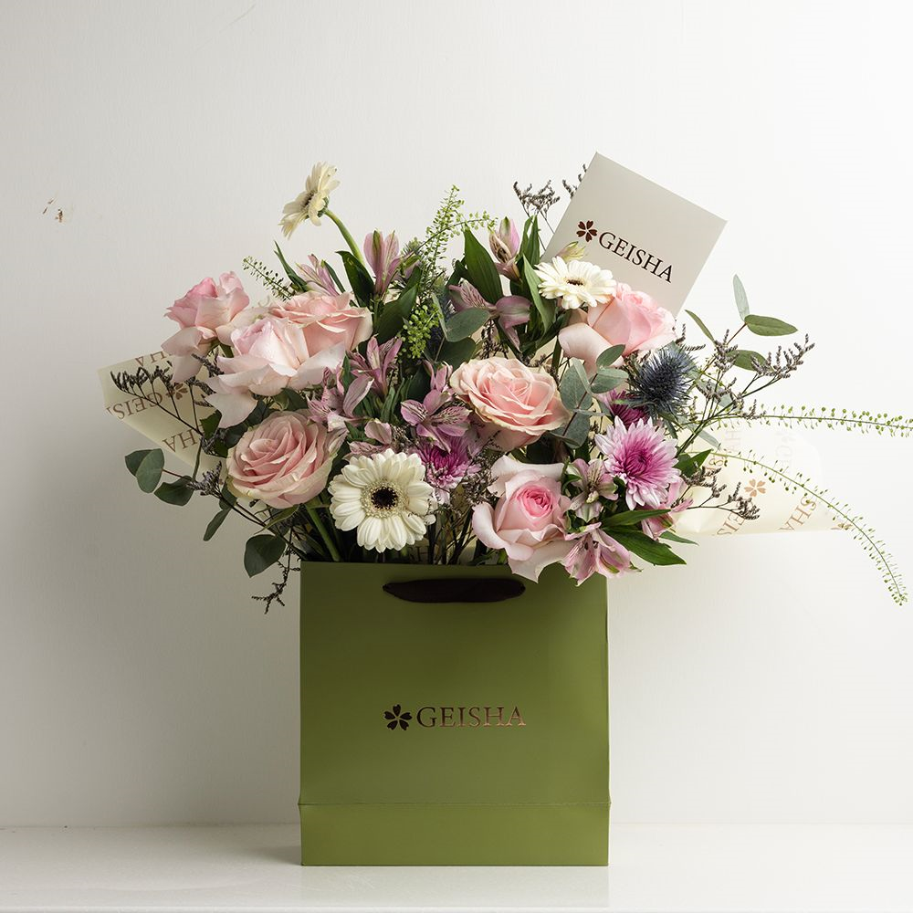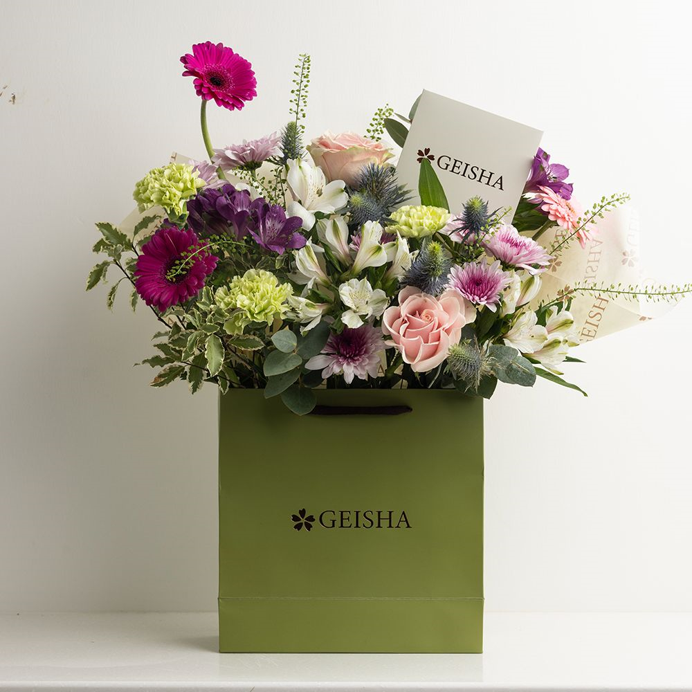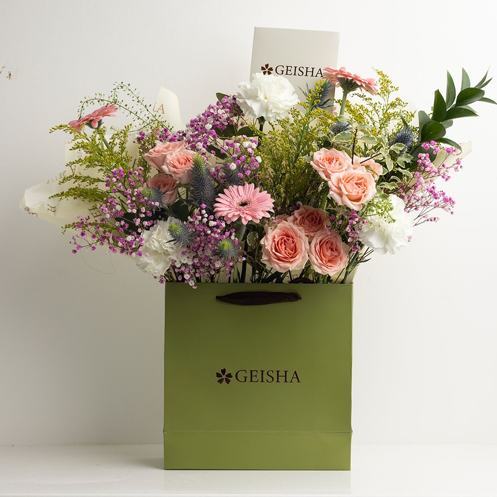 صندوق يحتوي على الجوري، الجيربيرا، الهايدرنجا وزهور الكريز.