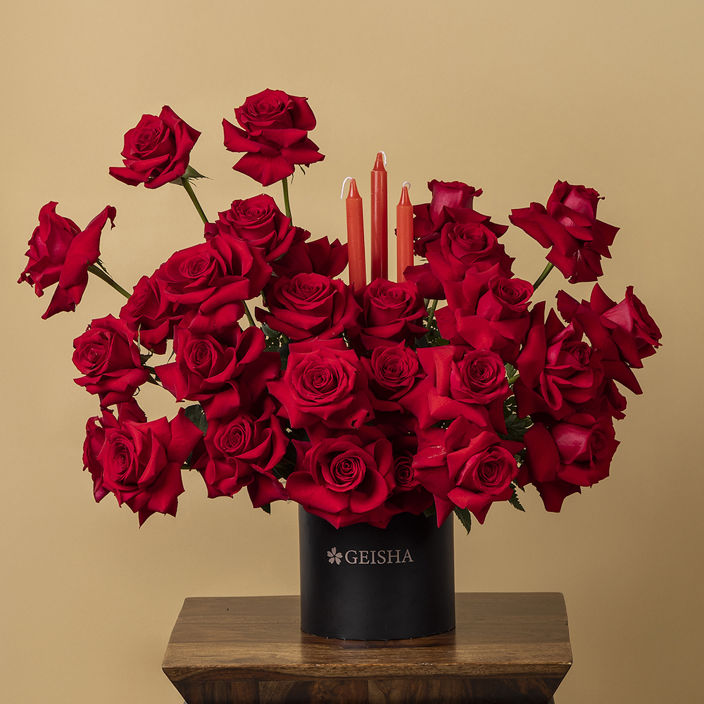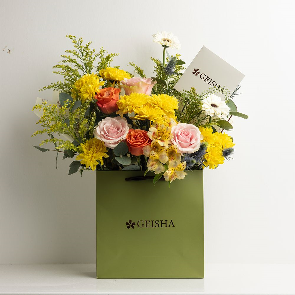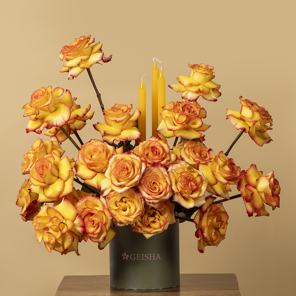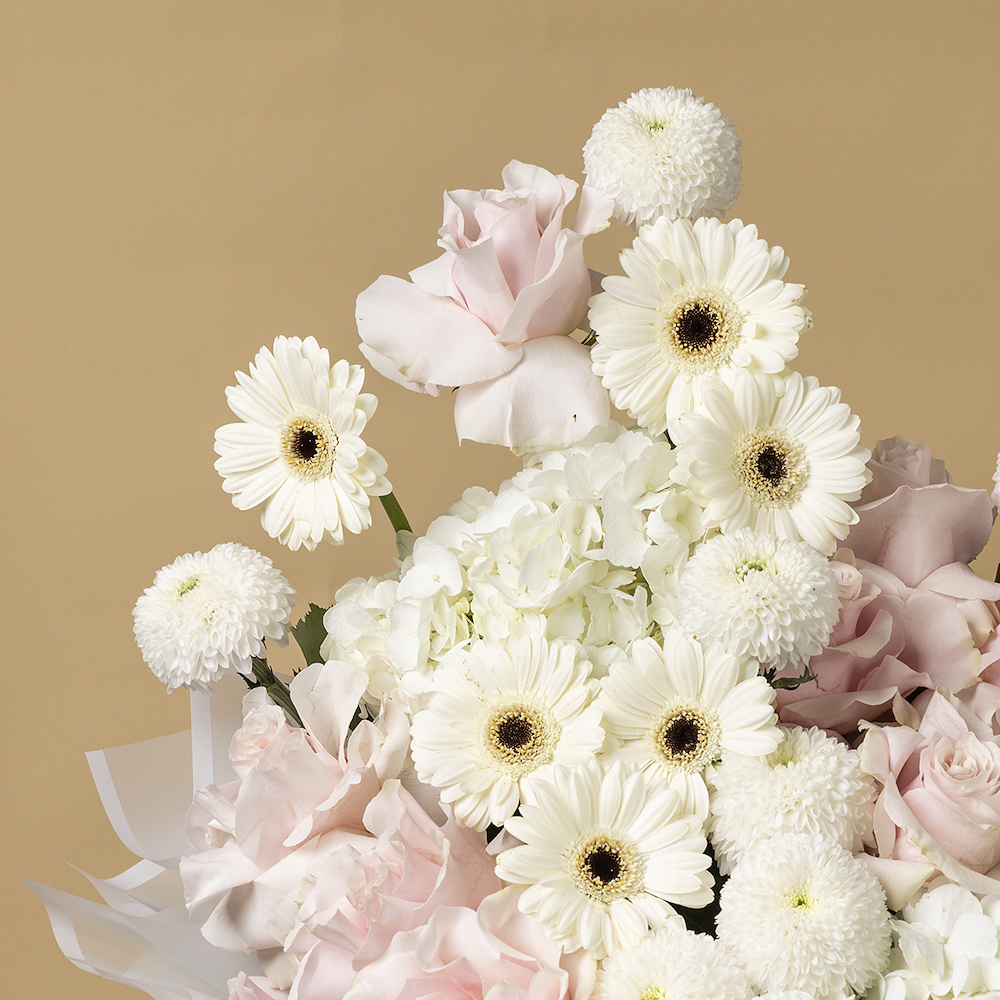 صندوق يحتوي على الجوري، الجيربيرا، الهايدرنجا وزهور الكريز.