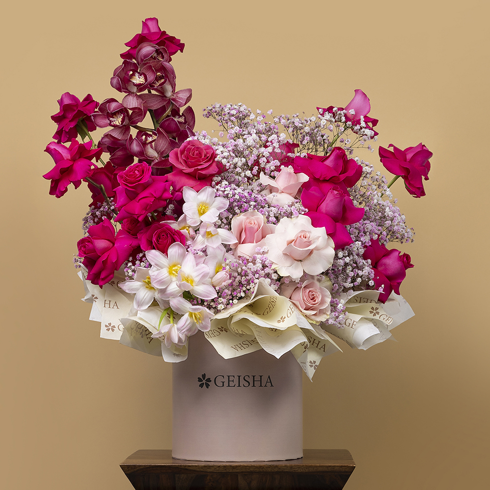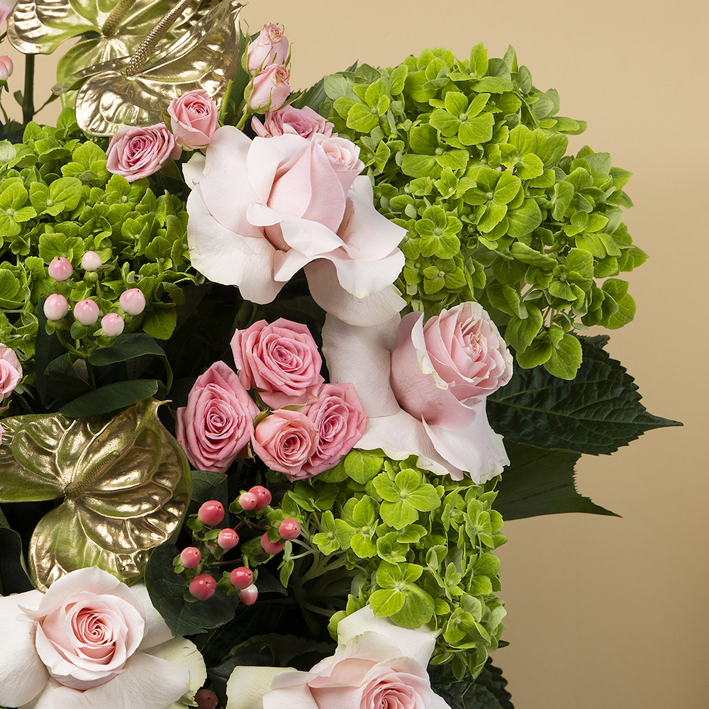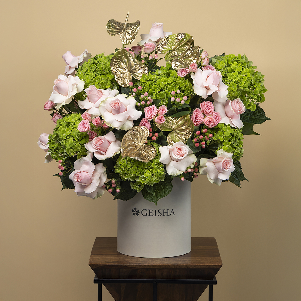 بوكس أنيق بمزيج من أزهار الهايدرنجا، الجوري و أنثوريوم والهايبيركم.