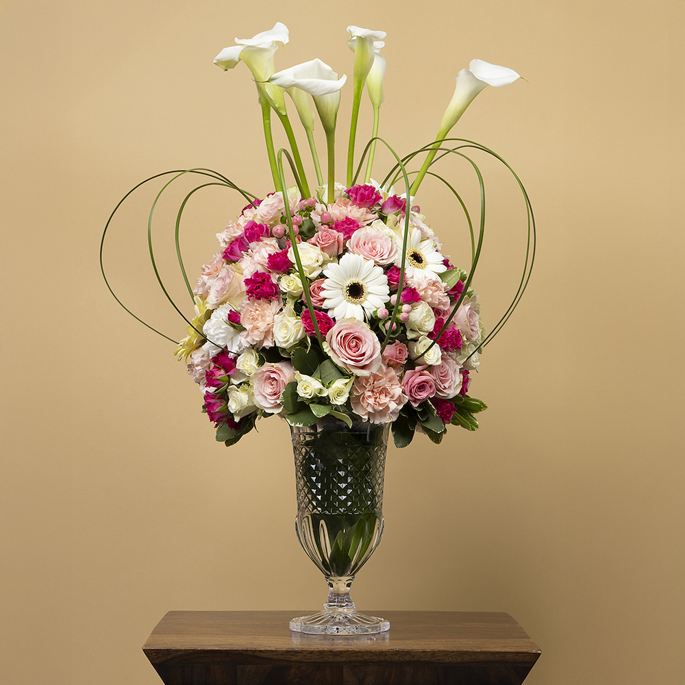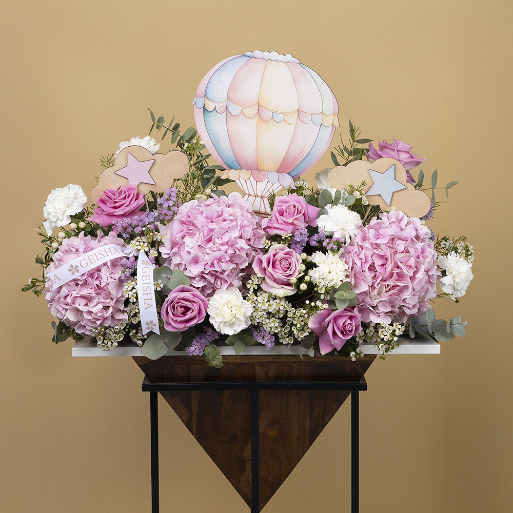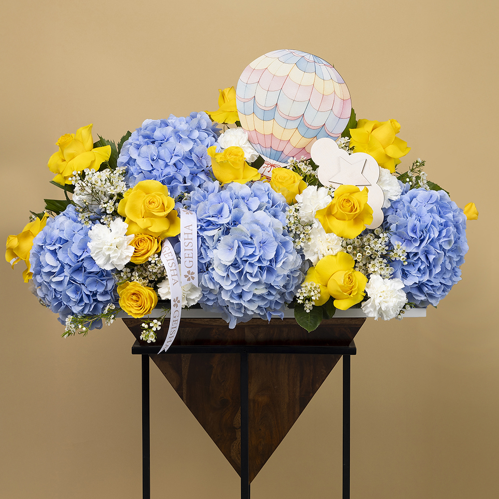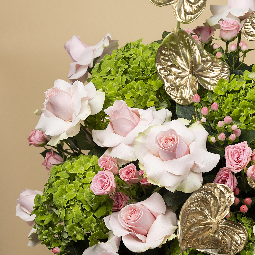 بوكس أنيق بمزيج من أزهار الهايدرنجا، الجوري و أنثوريوم والهايبيركم.