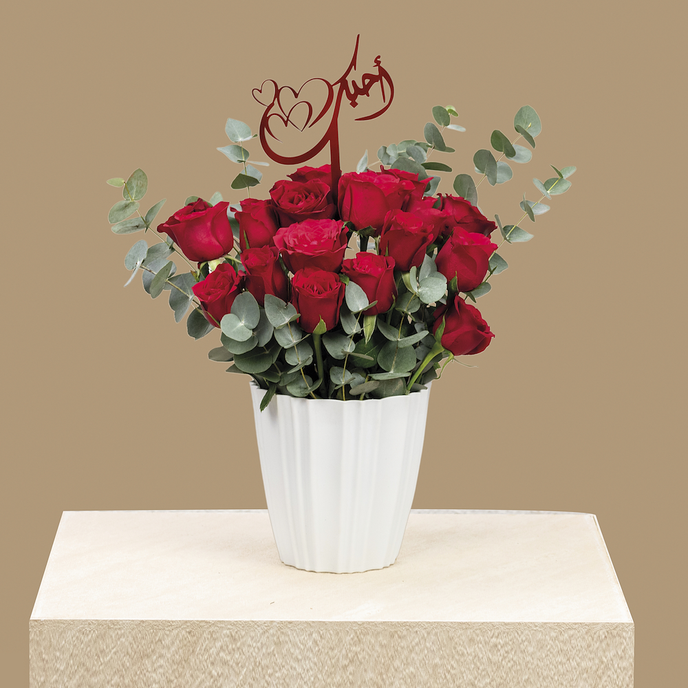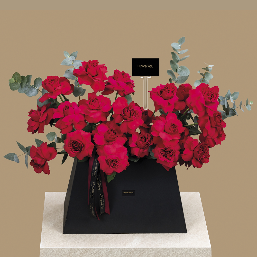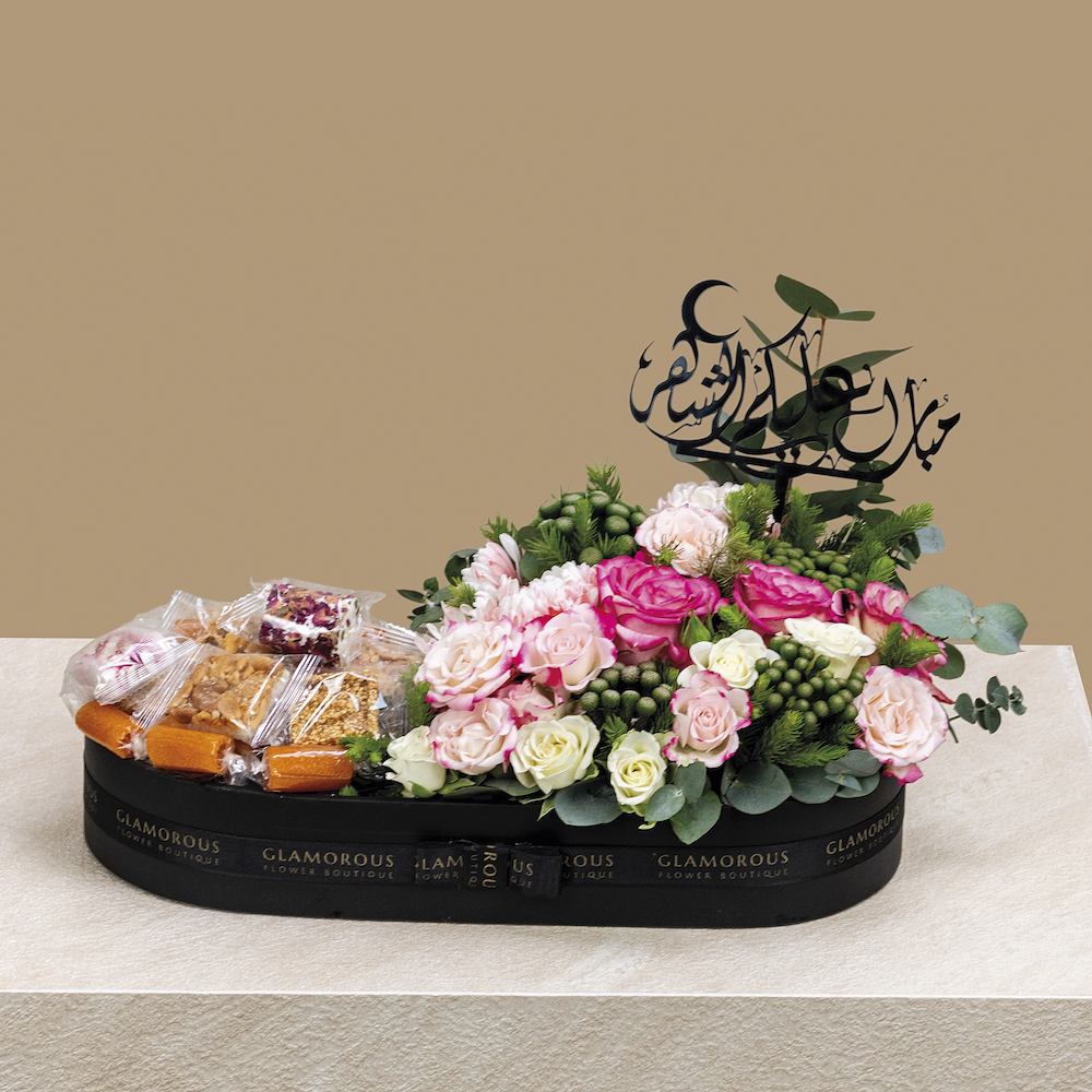 باقة تحتوي على الأوركيد، الجوري الهولندي، البيبي روز، الأوراق الخضراء والترسليوم.