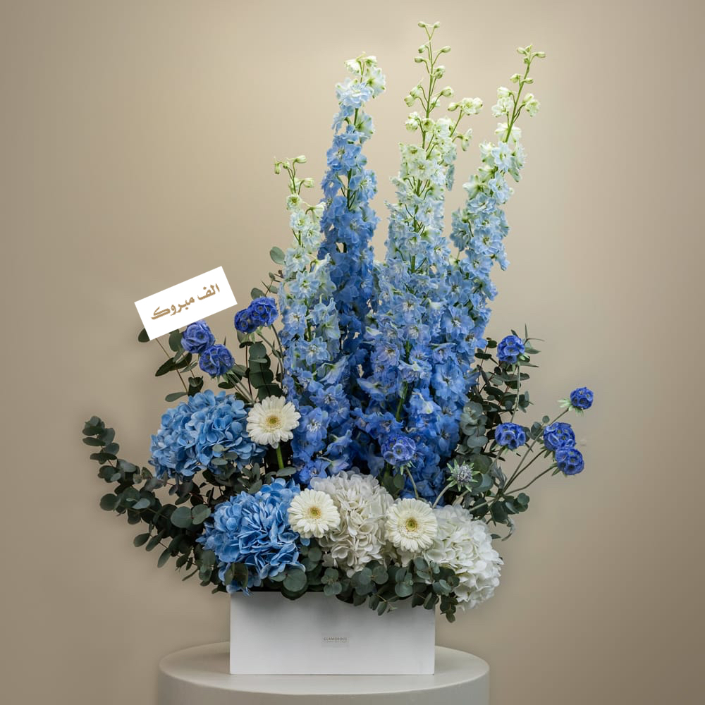 صندوق يحتوي على الهايدرنجا، الدلفينيوم والجيربيرا.