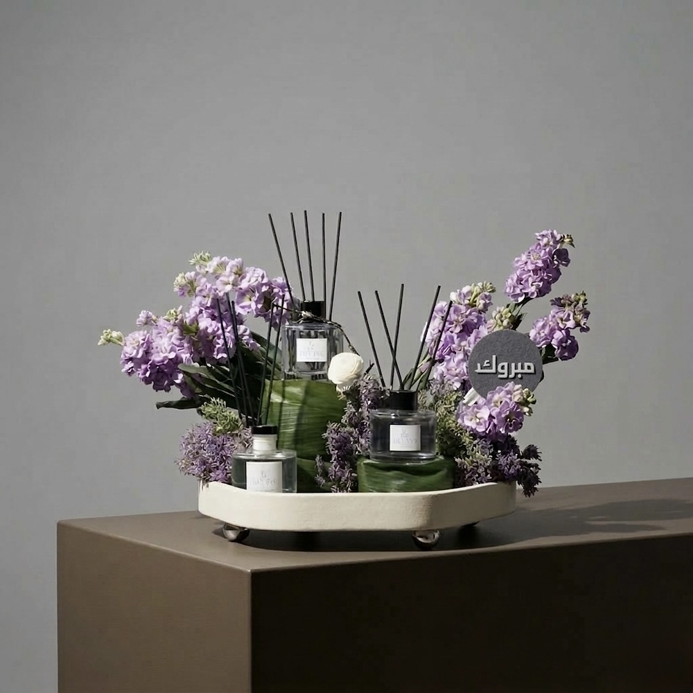 زهور الجوري، البيبي جوري والجيربيرا مرتبة بشكل جميل في سلة مع علبة من الحلويات.