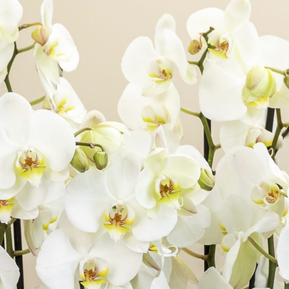 بلانتر مليئ بنباتات الأوركيد، مع الكرات الخضراء بتصميم أنيق وعصري.