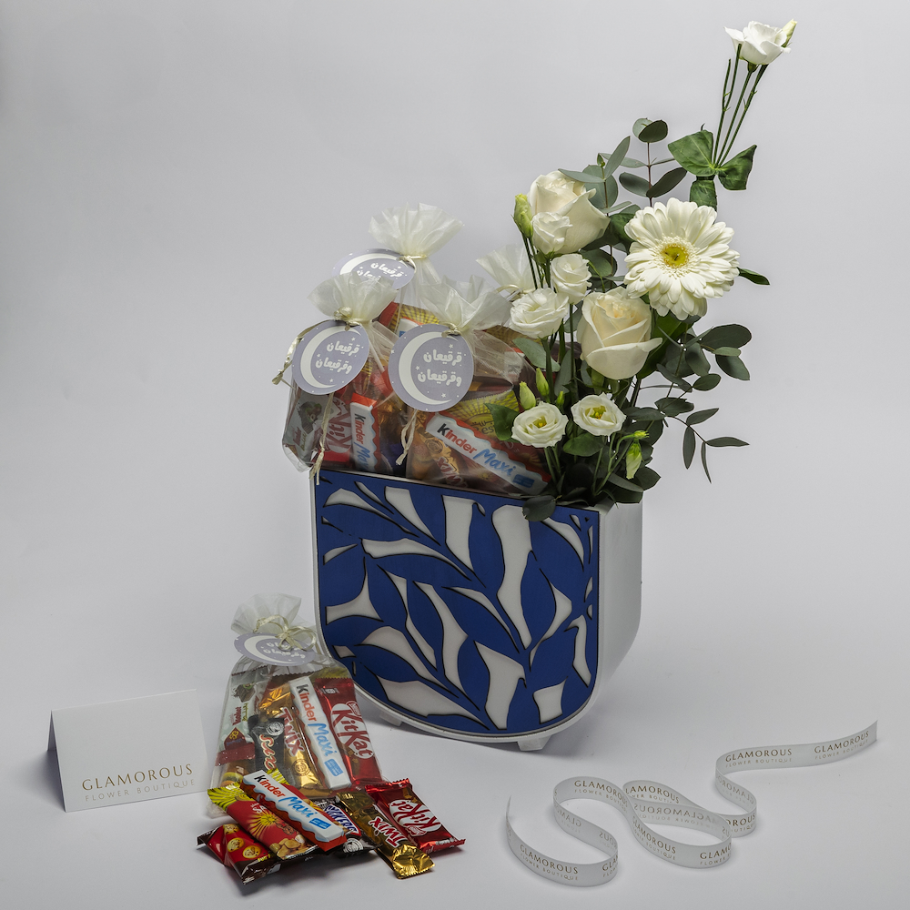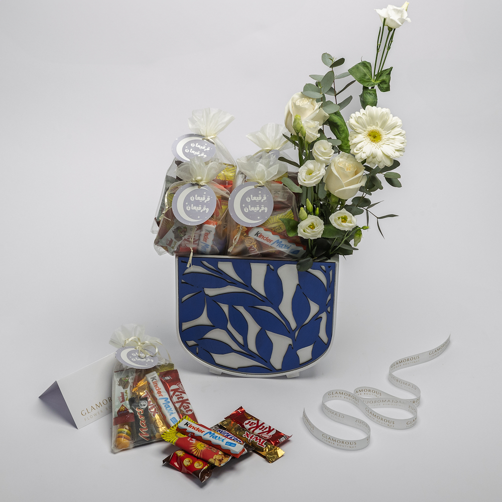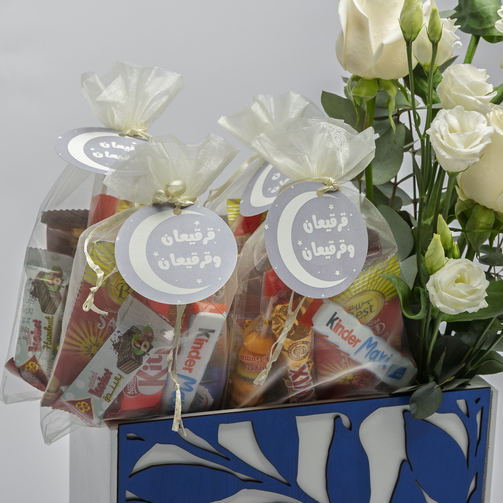 صندوق زهور البيبي روز والكرنيشن ويوكاليبتوس ومجموعة من حلو القرقيعان.