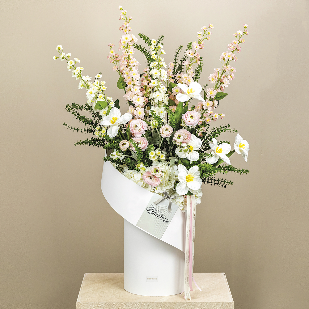 زهور دلفنيوم الابيض والوردي ورنن كولاس وهيدرنجا صناعي كوالتي.