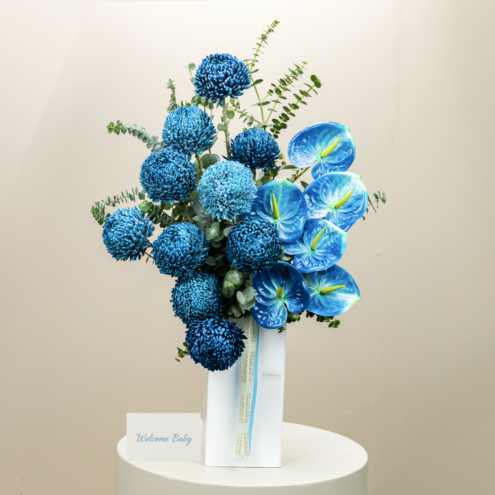 تحتوي الباقة على زهور الأنثوريوم والكريز باللون الأزرق مع أوراق الأوكالبتوس، مرتبة بشكل جميل.