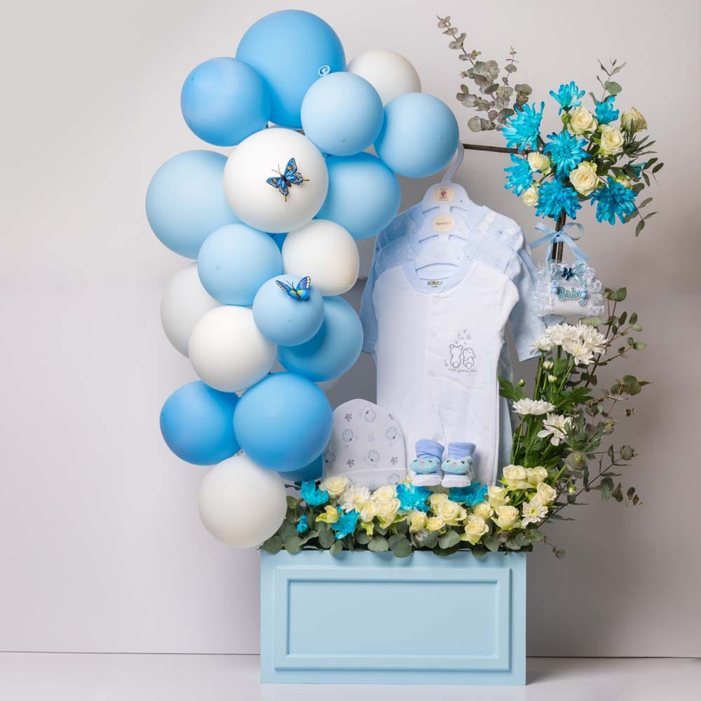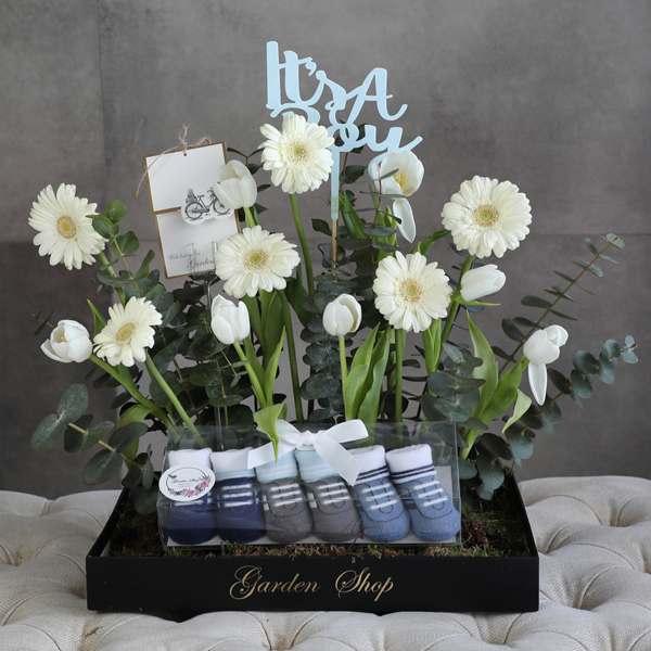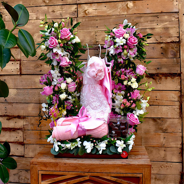 قاعدة خشبية تحتوي على زهور الجوري والأوكالبتوس مع الشوكولاتة، حذاء وثياب الأطفال.
