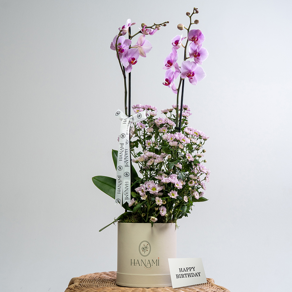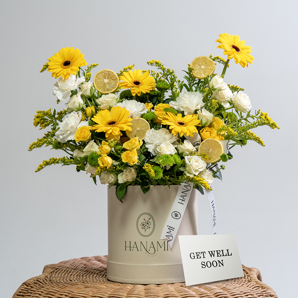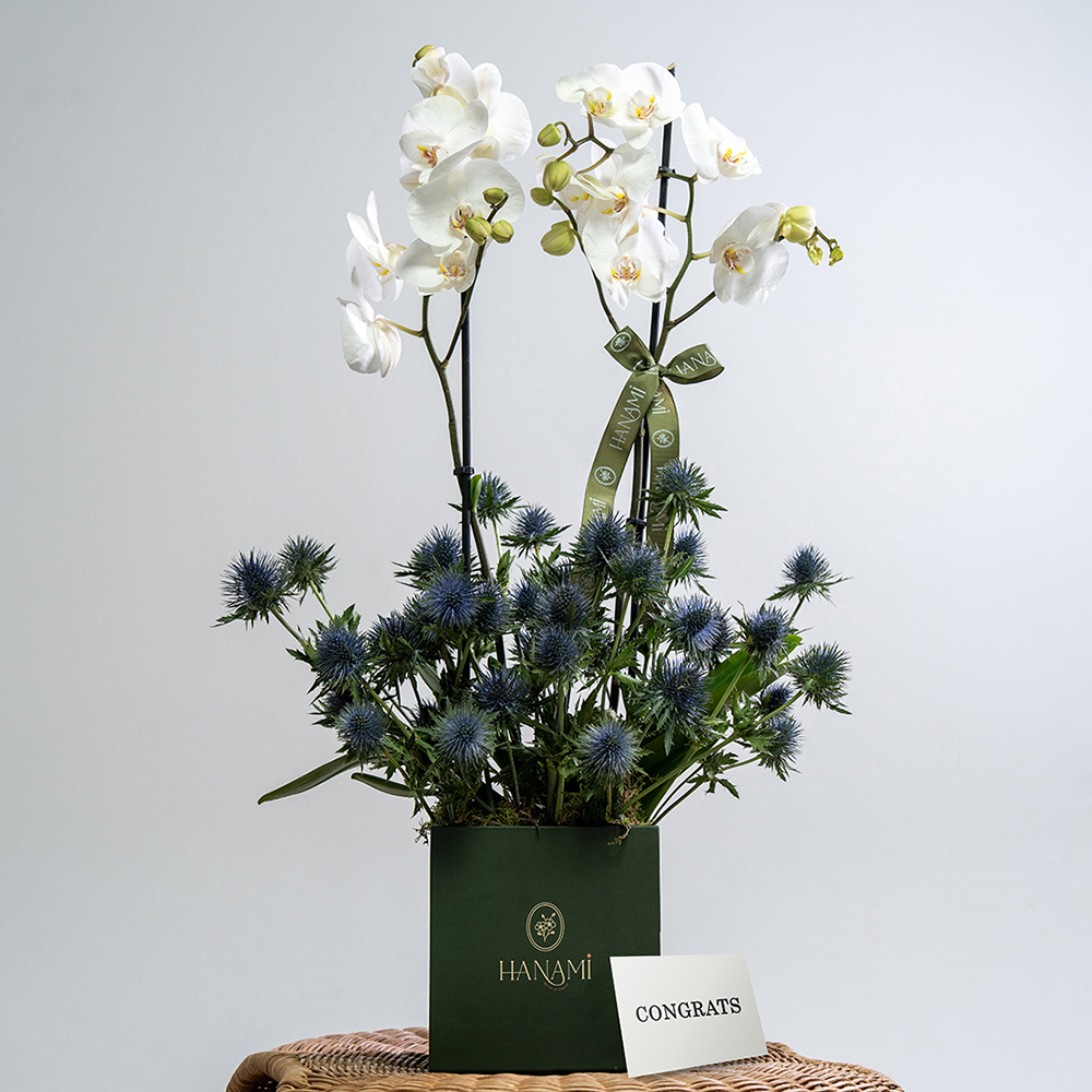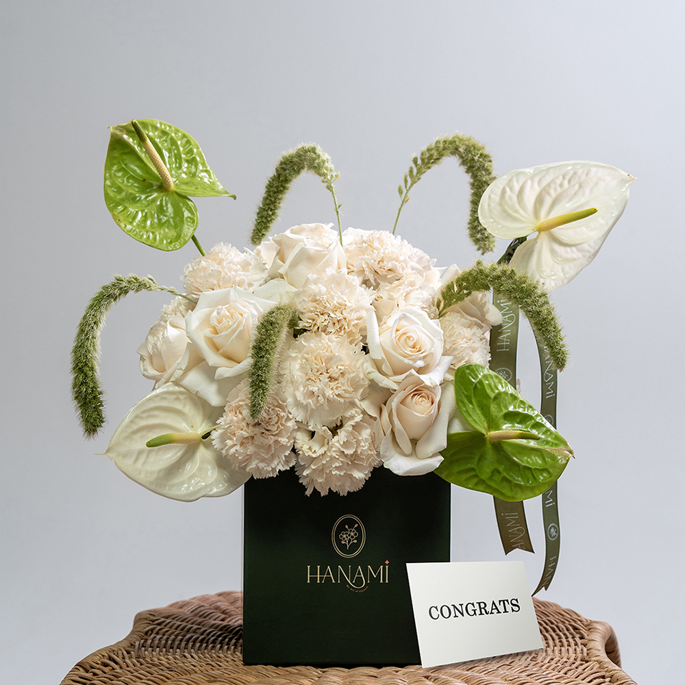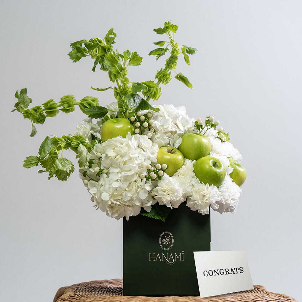 بوكس يحتوي على هايدرنجا، هايبركم، كارنيشن، مونوسيلا، وتفاح، ملاحظة التفاح يستخدم لغرض اللمسات الانيقة فقط وغير صالح للاكل.