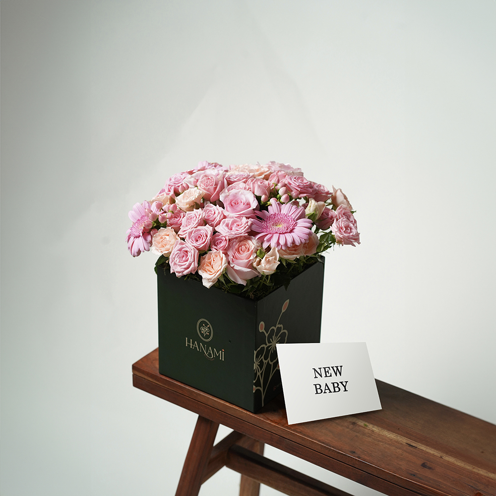 صندوق يحتوي على الجوري، الجيربيرا والهايبريكوم.