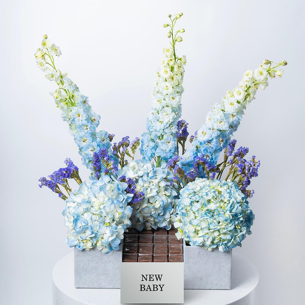 علبة تحتوي على زهور الستاتيس، الهايدرينجا والدلفينيوم الزرقاء، منسقة بشكل جميل الشوكولاتة. مثالية للإحتفال بقدوم مولود جديد.