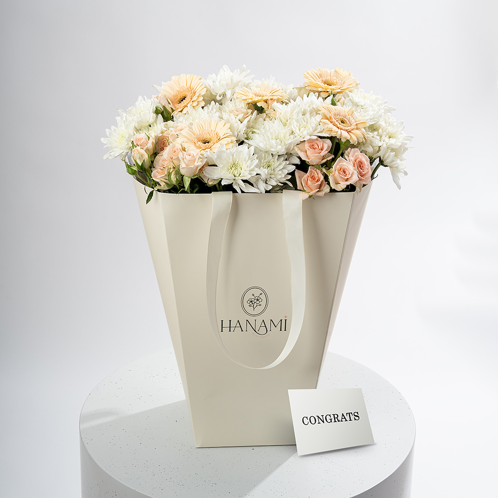كيس يحتوي على زهور الكريز، الجيربيرا والبيبي جوري، مرتب بشكل جميل.