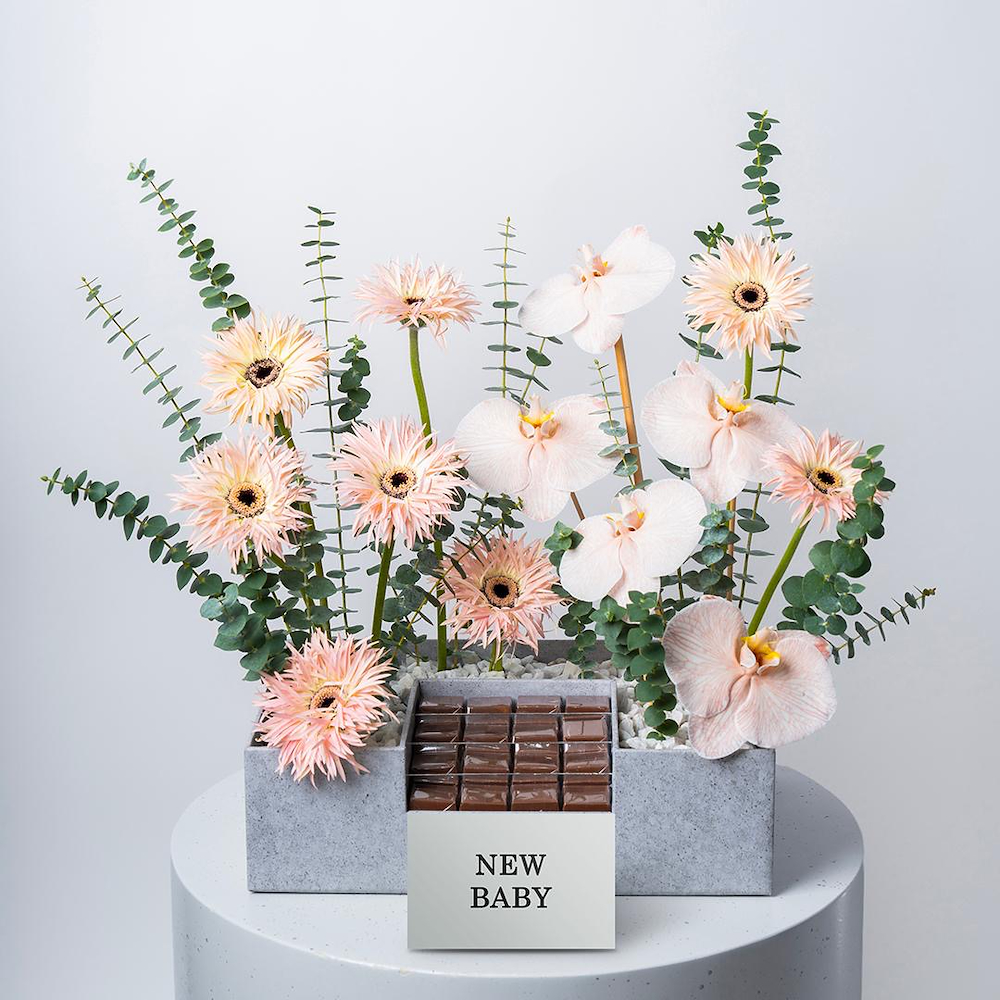 علبة تحتوي على زهور الجيربيرا والأوركيد الوردية، منسقة بشكل جميل الشوكولاتة. مثالية للإحتفال بقدوم مولودة جديدة.
