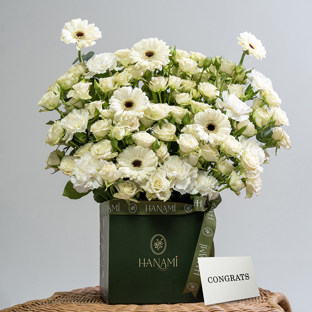 بوكس يحتوي على جربيرا، أزهار البيبي روز، الكارنيشن، والأوكالبتوس.