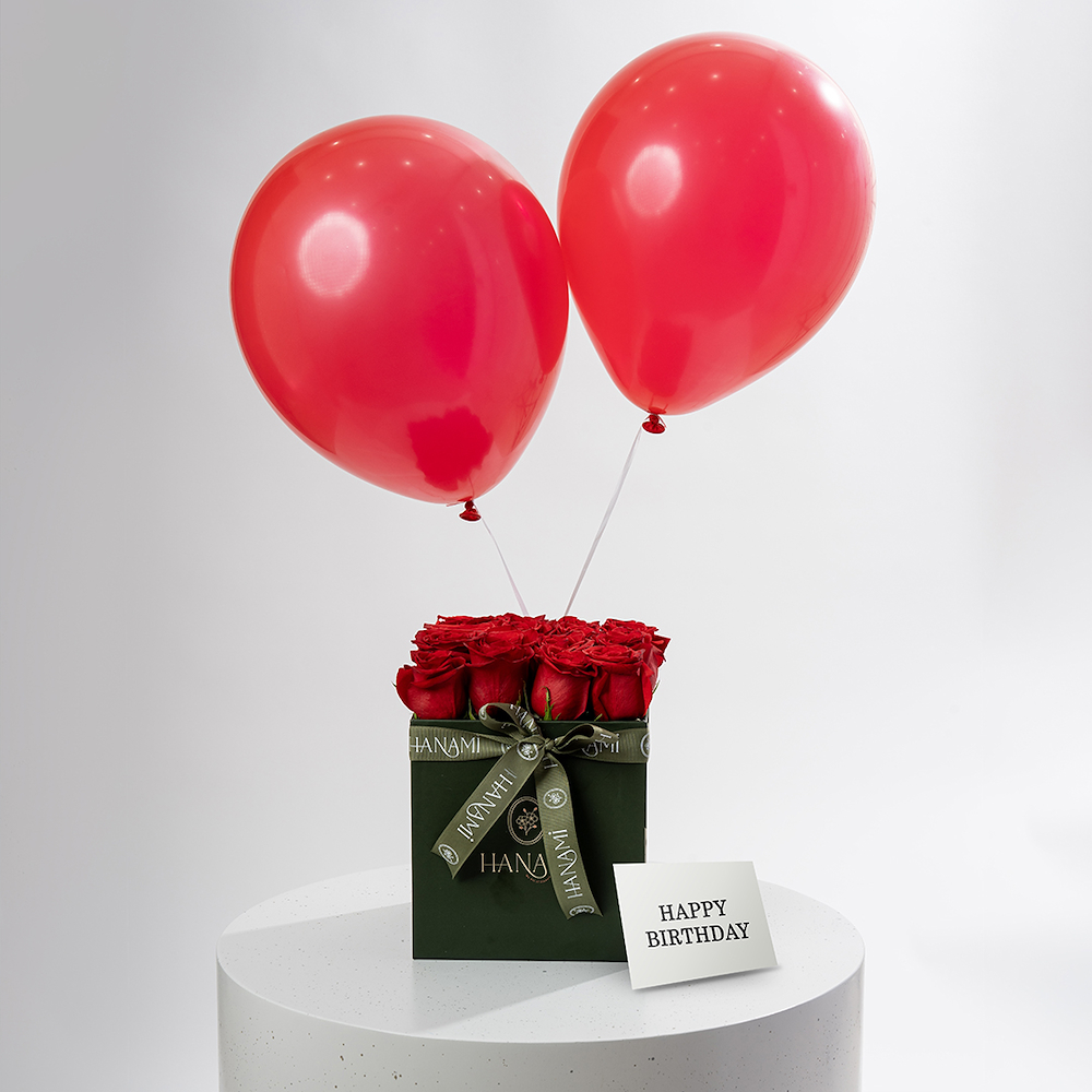 تنسيقة زهور تحتوي على الجوري الأحمر وبالونتين.