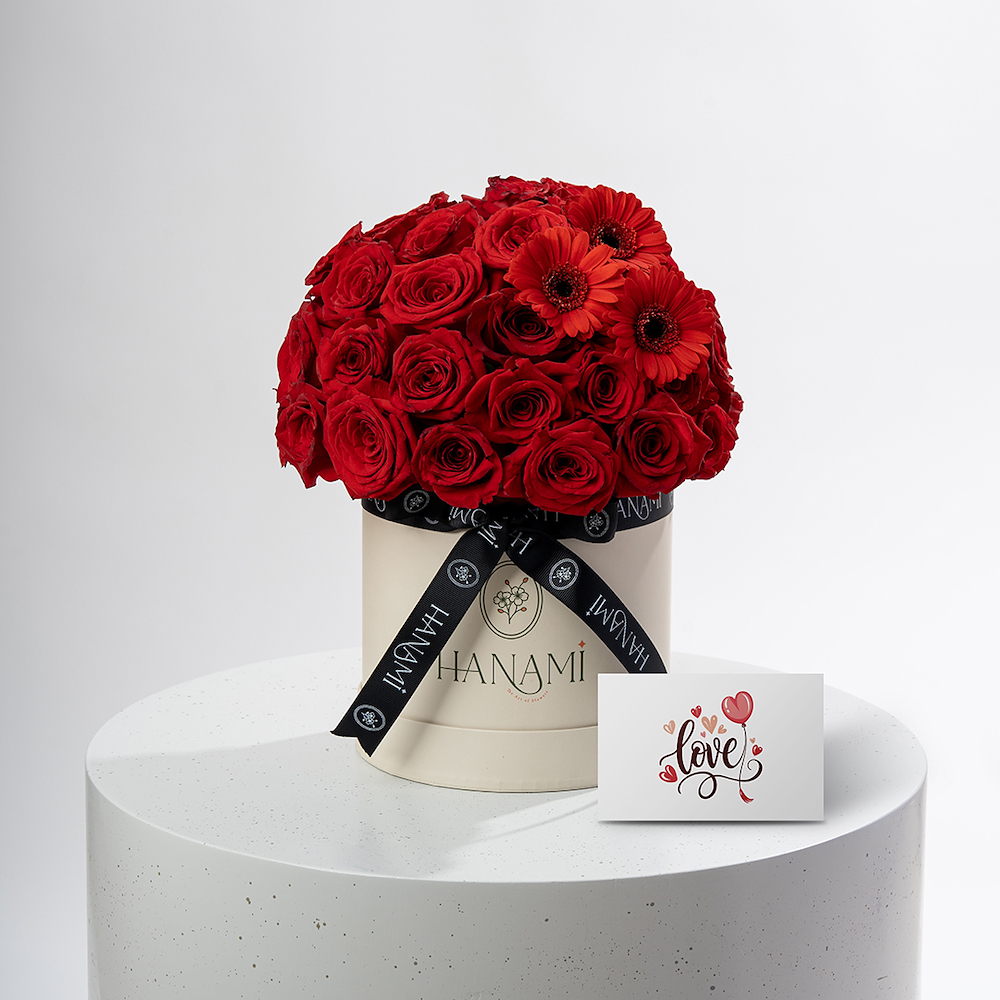 صندوق يحتوي على زهور الجوري والجيربيرا الحمراء، منسقة بشكل جميل. مثالية لإضفاء البهجة على يوم من تحب.