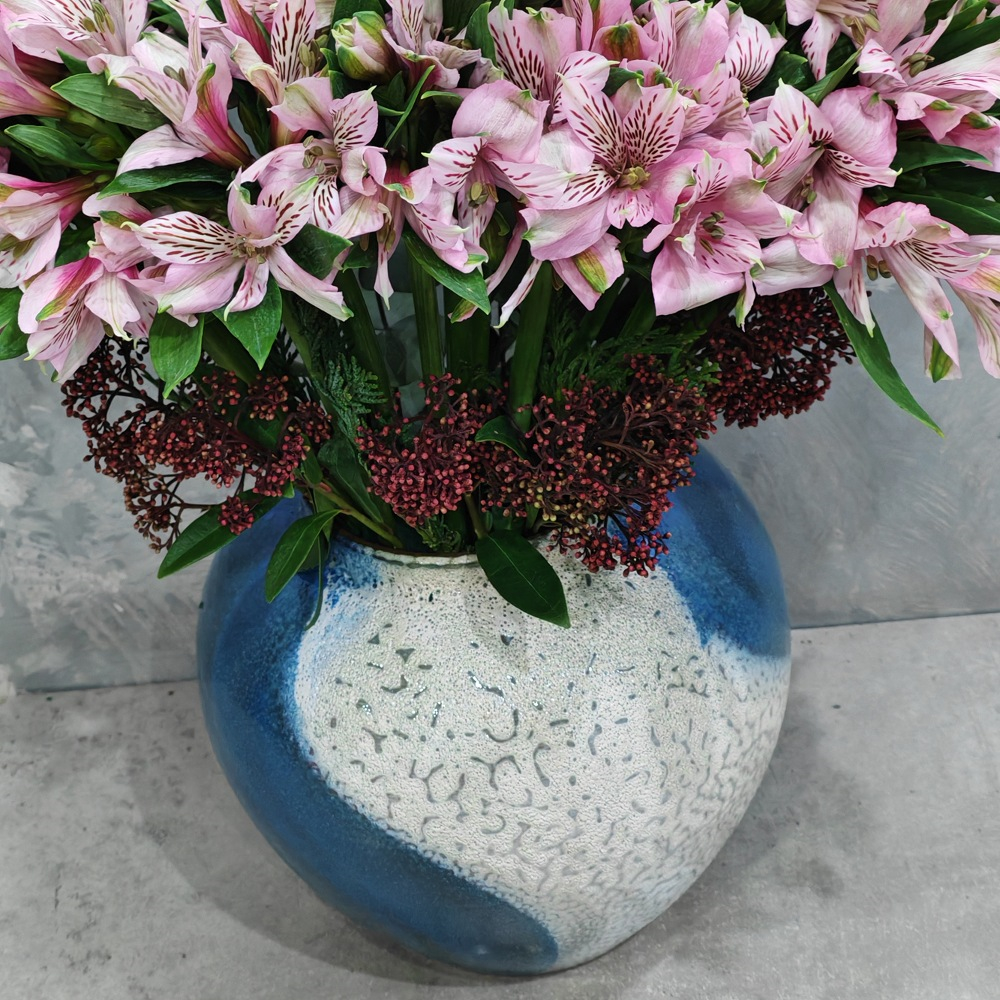 باقة تحتوي على زهور الألستروميريا الوردية والسكيميا الحمراء، مرتبة شكل جميل في فازة.
