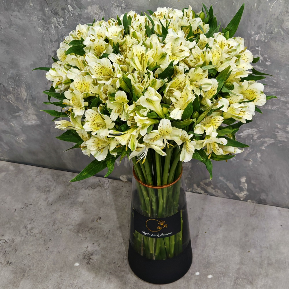 فازة أنيقة مليئة بأزهار السترومريا البيضاء.