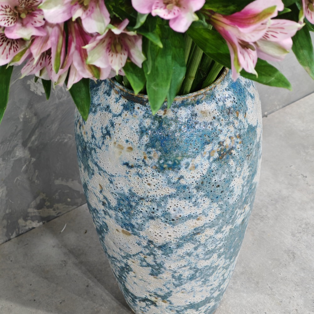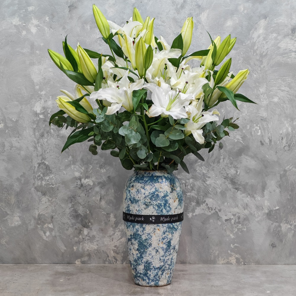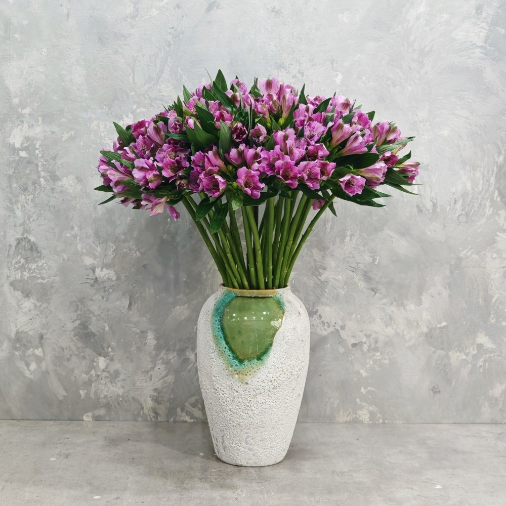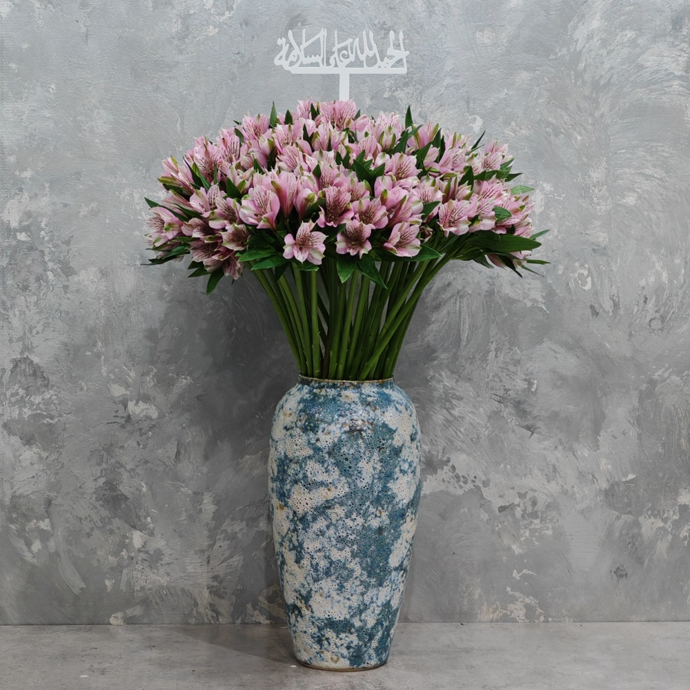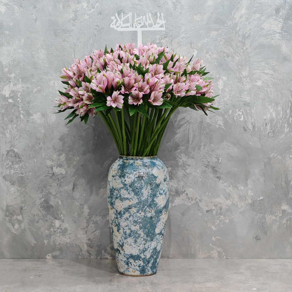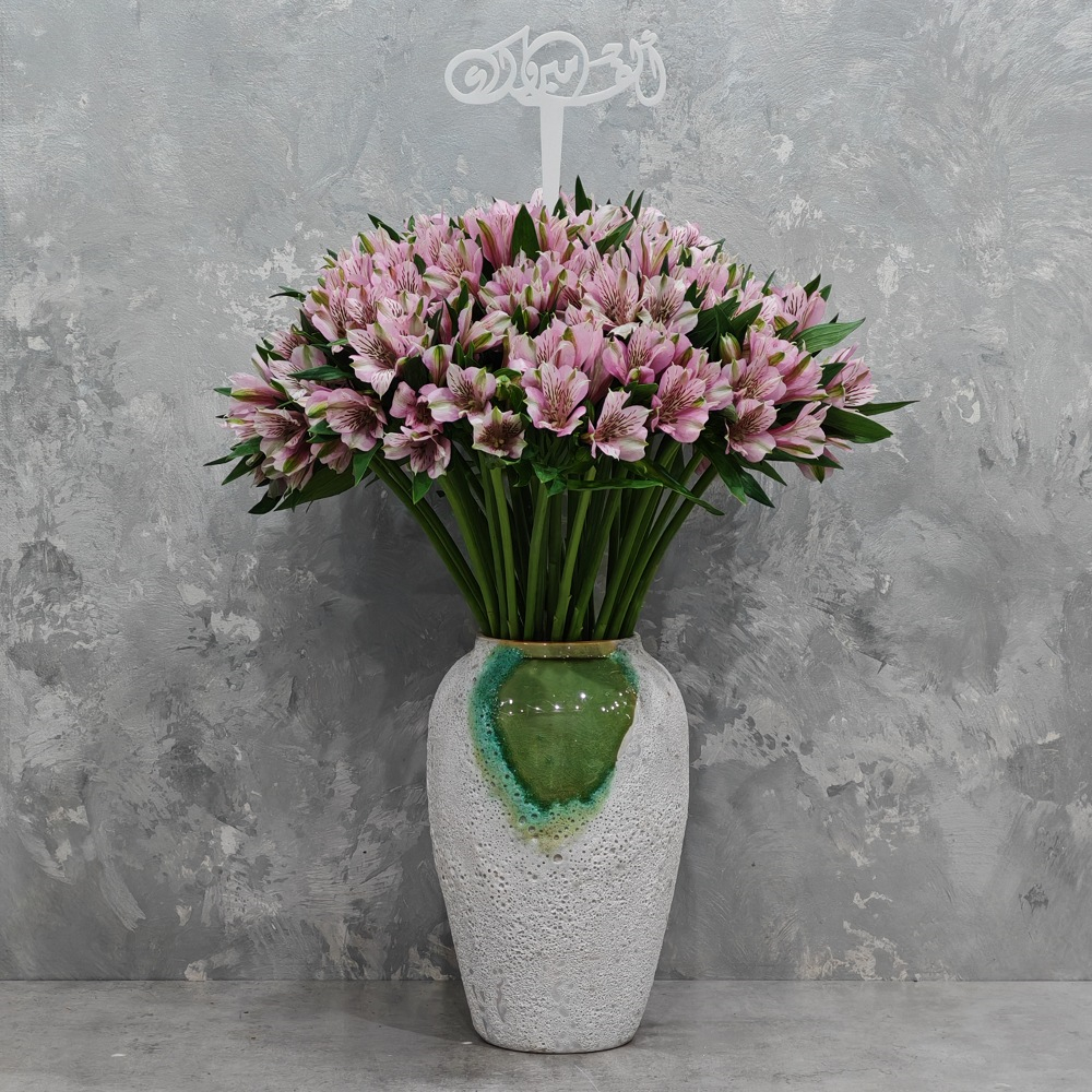 باقة تحتوي على زهور الألستروميريا الوردية، مرتبة بشكل جميل في فازة.