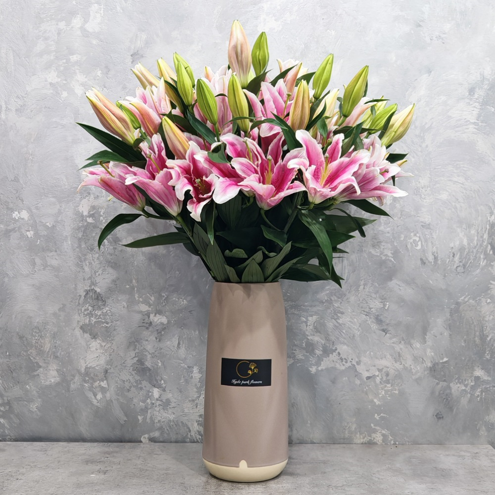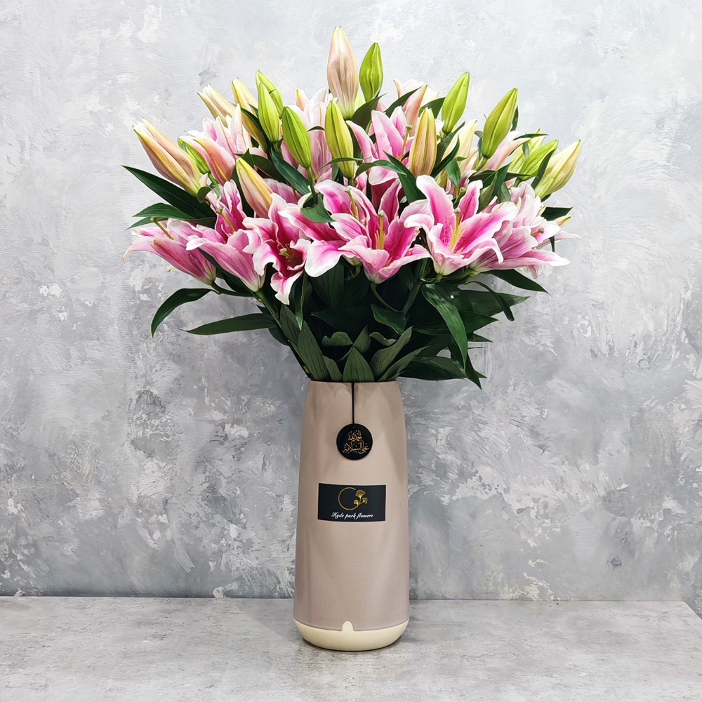 باقة تحتوي على زهور الليلي الوردية، مرتبة بشكل جميل في فازة.