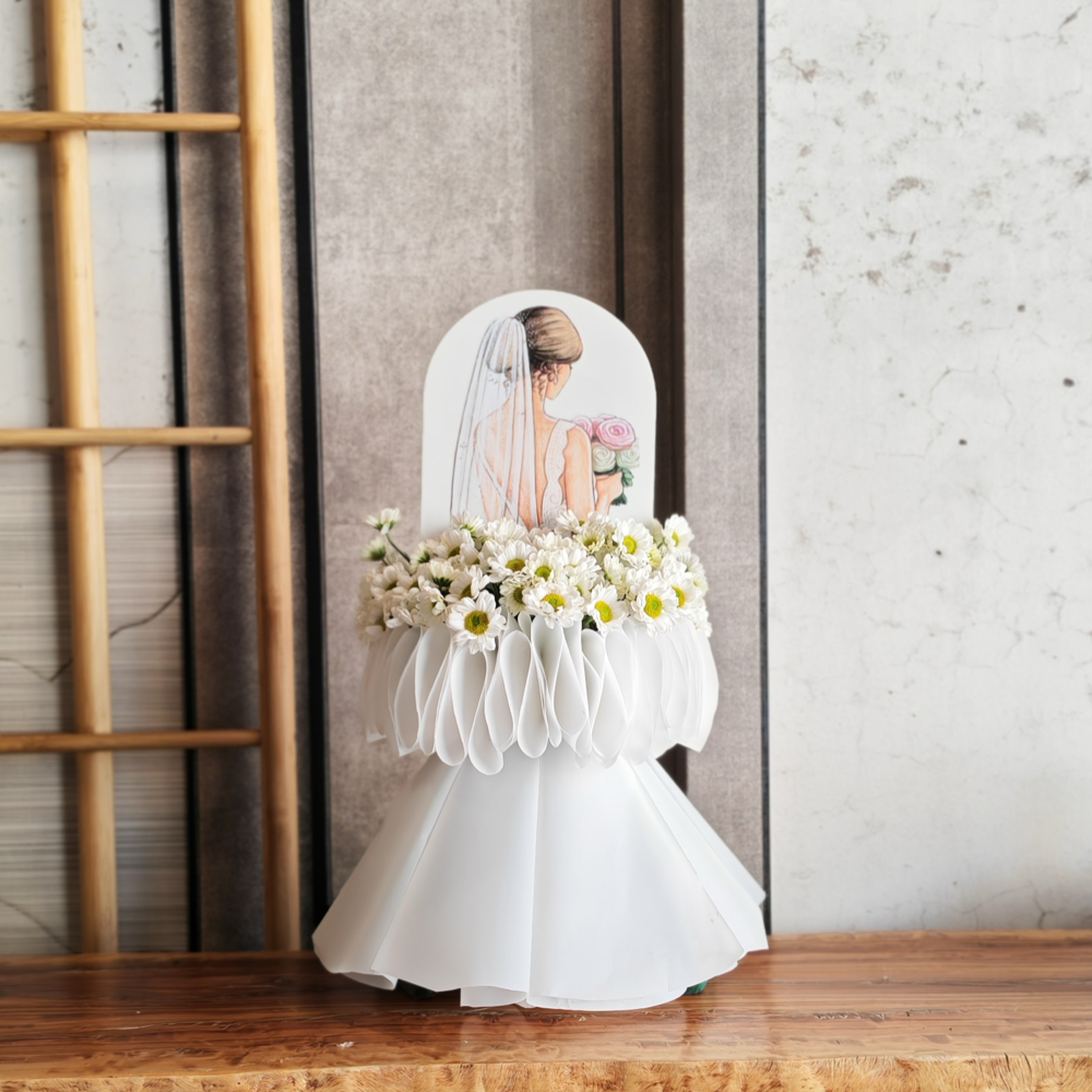 ستاند أنيق بتميم العروس يحتوي على زهور الكريزنتم مع الشوكولاتة.