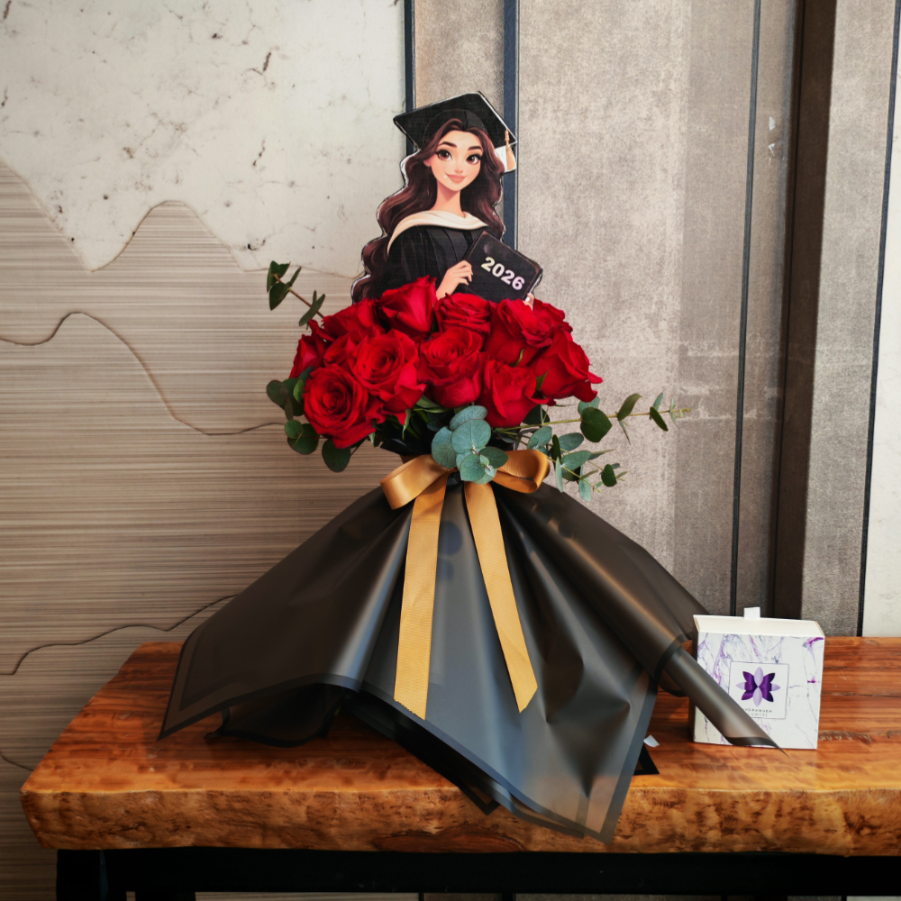 باقة يد جميلة مرتبة بزهور الجوري الحمراء، تأتي مع الشوكولاتة اللذيذة.