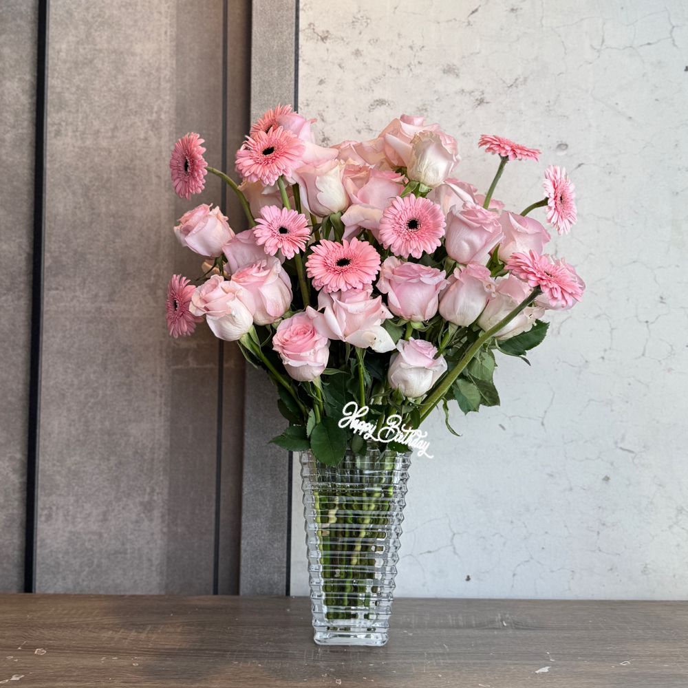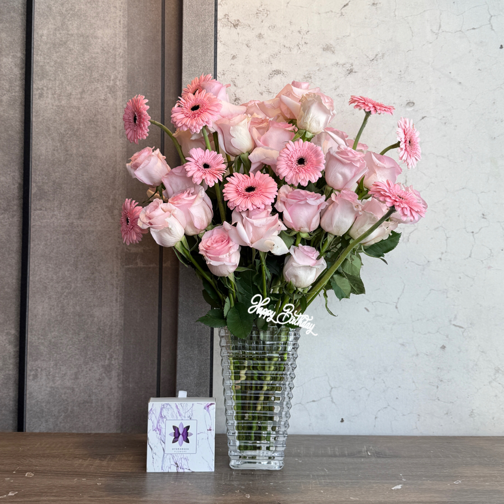 فازة تحتوي على زهور الجوري والجيربيرا، مرتبة بشكل جميل. تأتي مع الشوكولاتة البلجيكية.