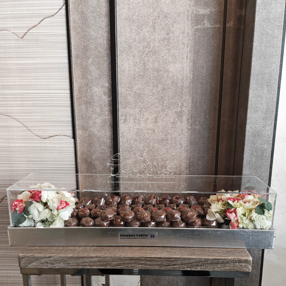 صينية أنيقة تحتوي على مزيج من الأزهار مع 1 كيلو من الشوكولاتة الفاخرة.
