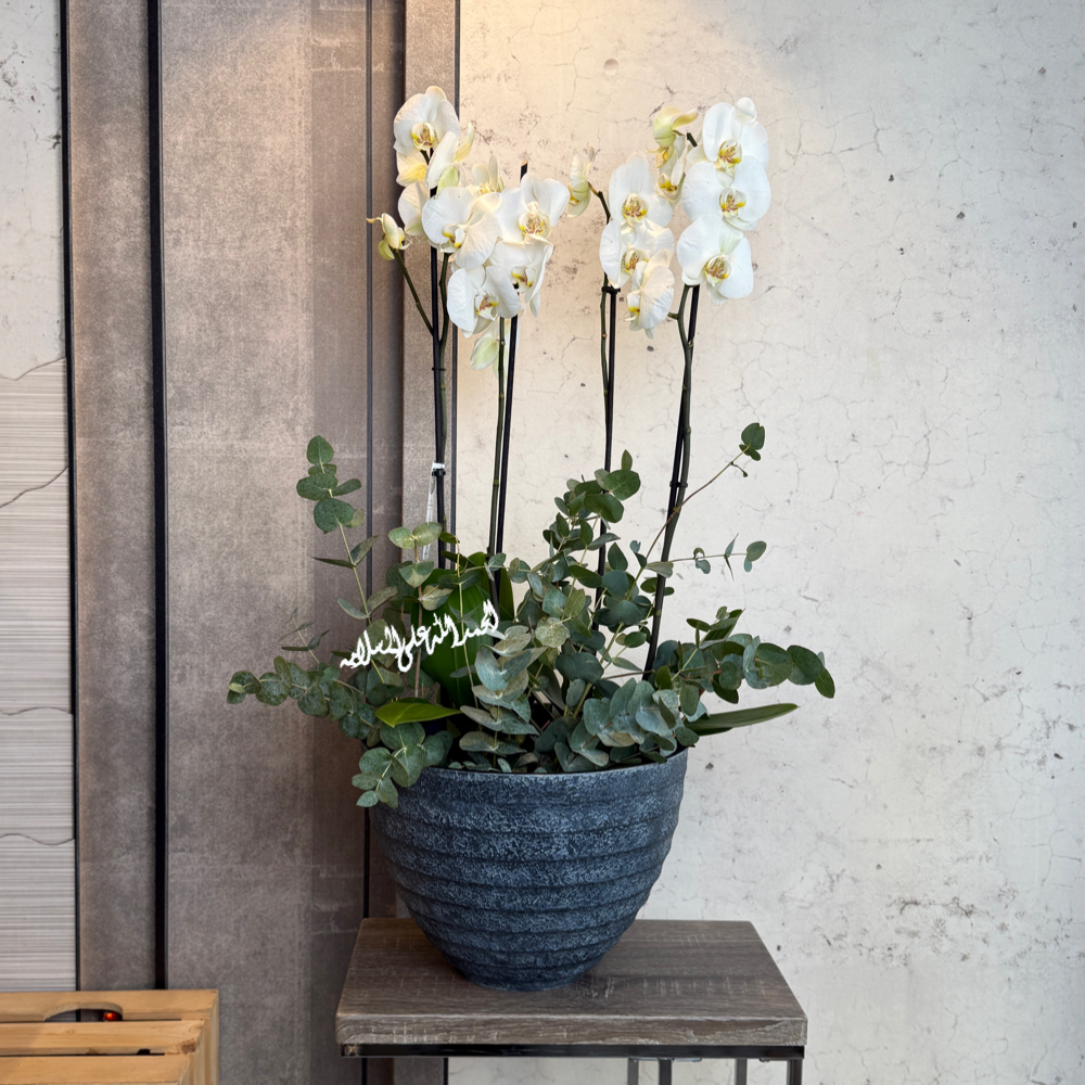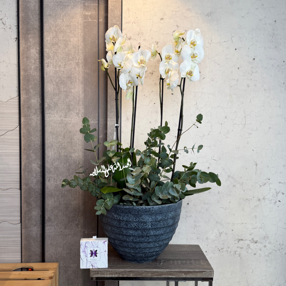 فازة فاخرة تتميز بنباتات الأوركيد والأوكالبتوس مع الشوكولاتة البلجيكية.