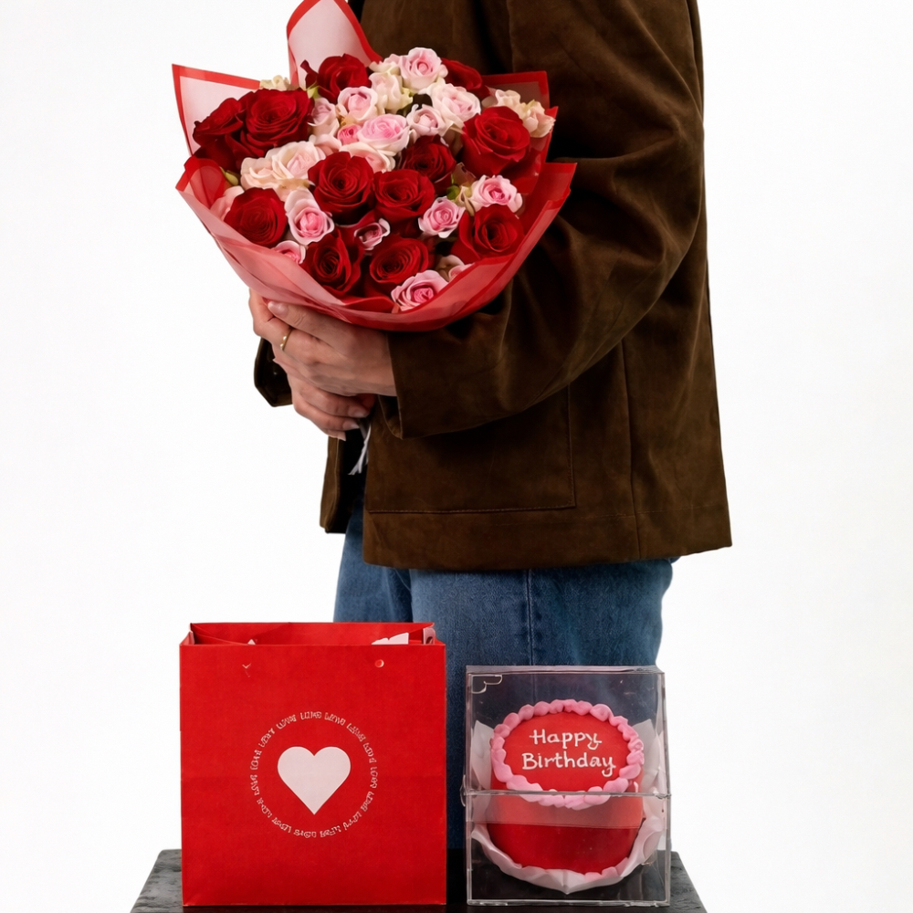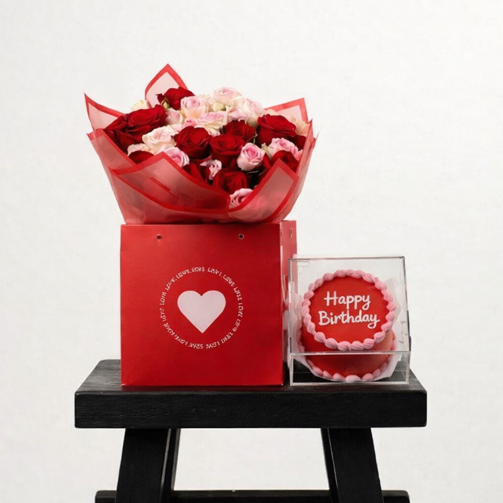 باقة يد مليئة بأزهار الجوري باللون الأحمر مع كيكة بينتو.