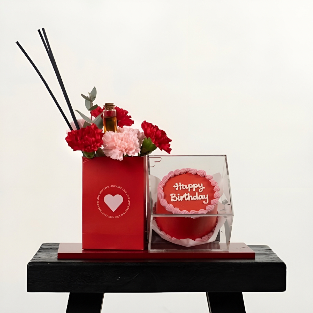 باقة تحتوي على زهور الكارنيشن الحمراء والوردية، مرتبة بشكل جميل في صينية. تأتي مع كيكة وفواحة سعتها 10 مل.
