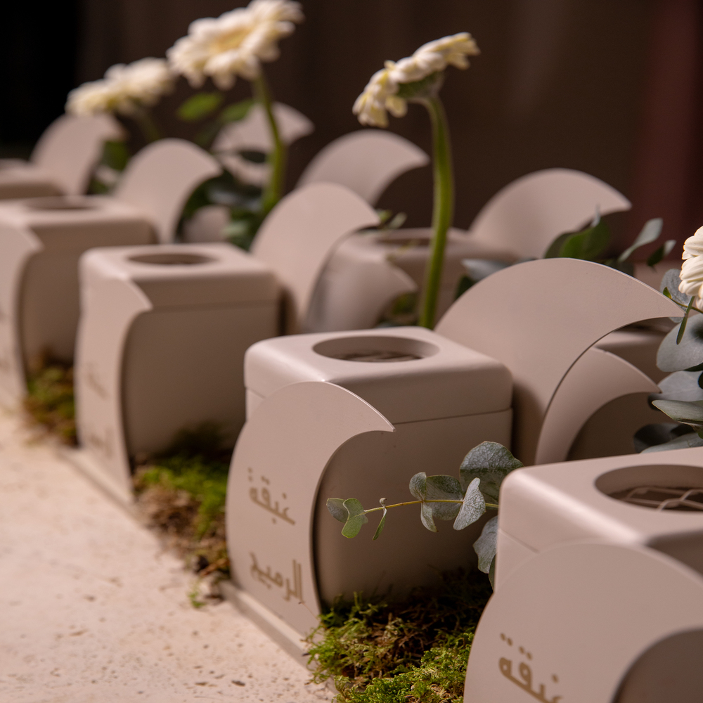 مجموعة تحتوي على 10 توزيعات من مباخر الهلال مع الاسم المخصص وأزهار الجربيرا.