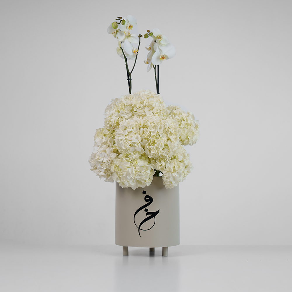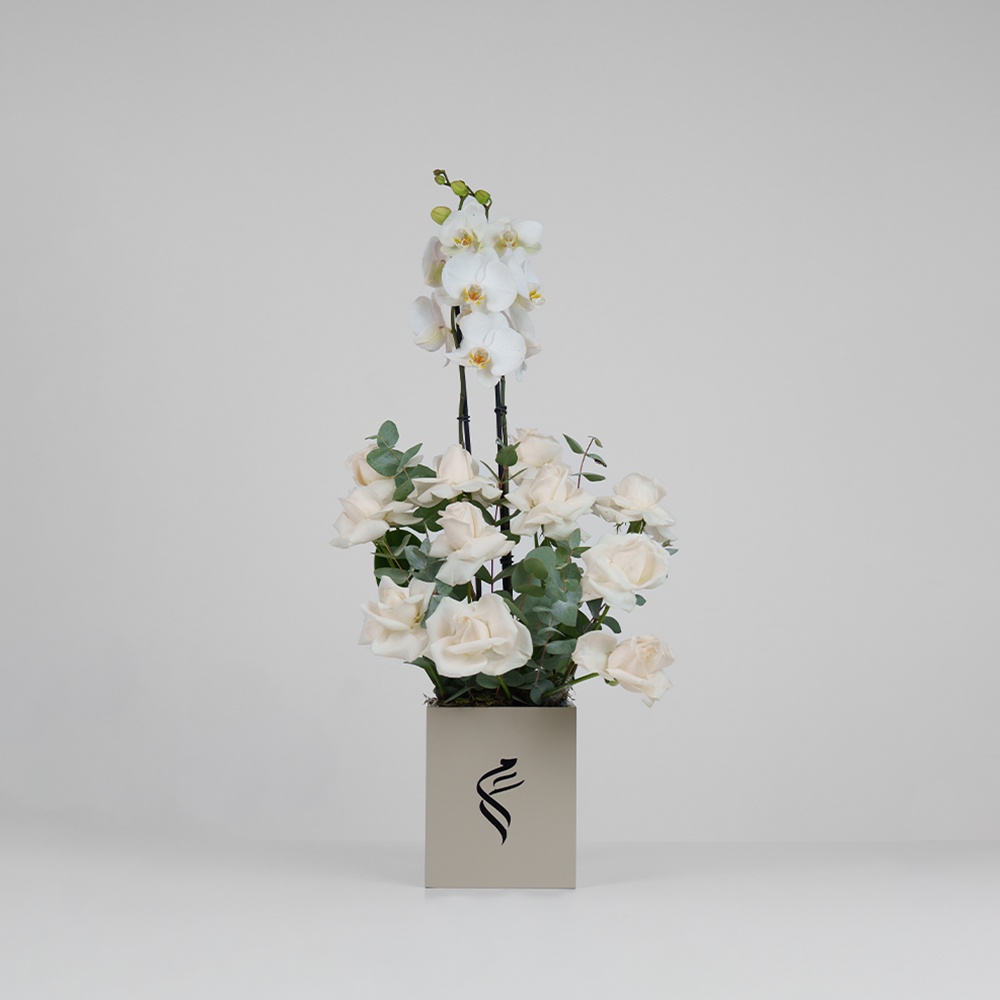 باقة تحتوي على زهور الأوركيد والجوري البيضاء، مرتبة بشكل جميل في صندوق.