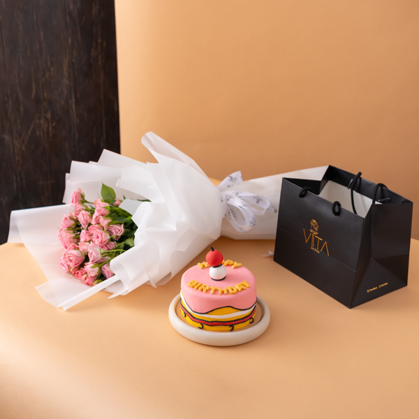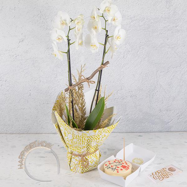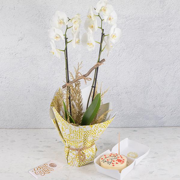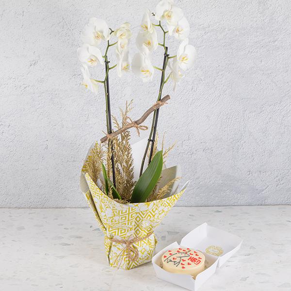 تحتوي هذه الباقة على نبات الأوركيد مع كيكة.