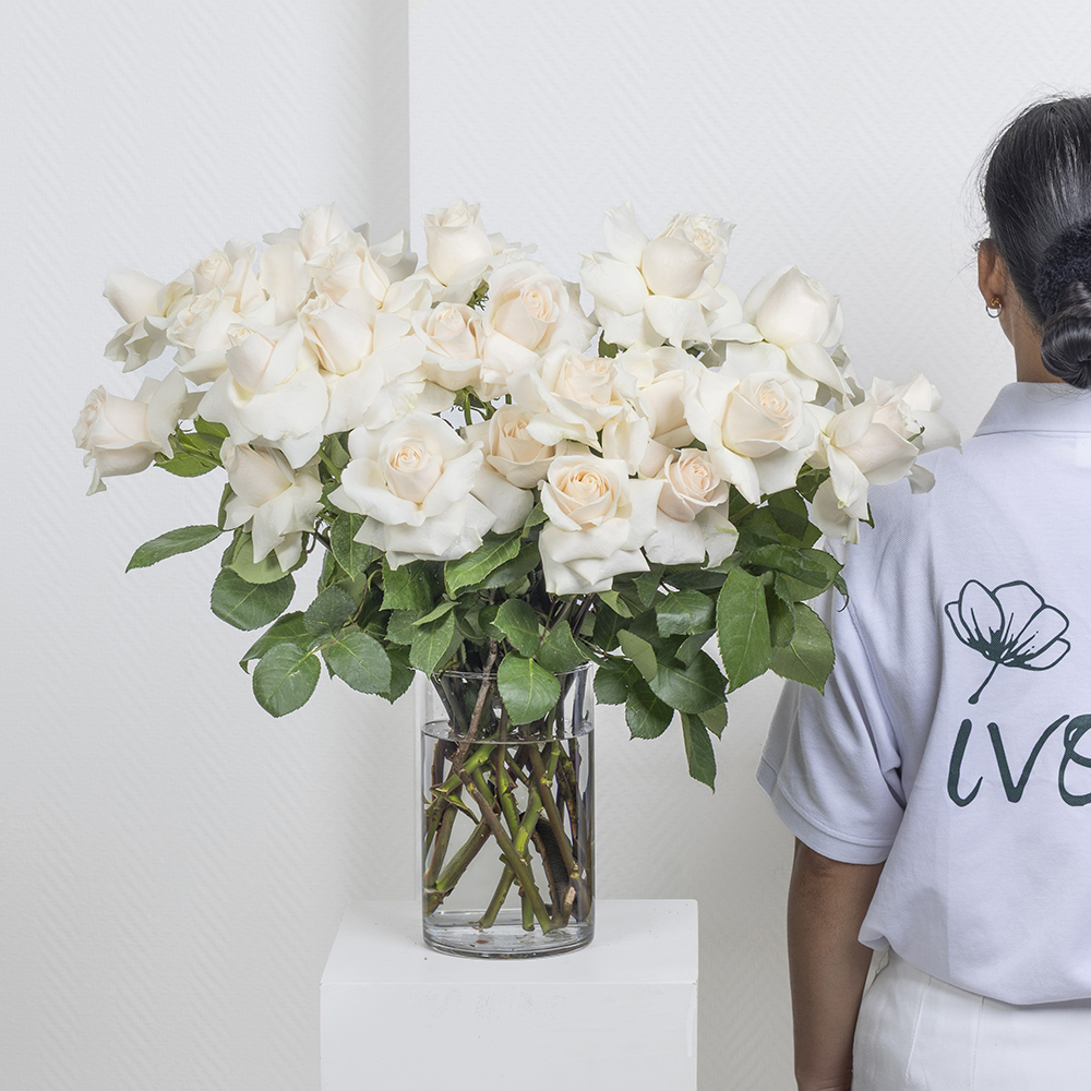 باقة تحتوي على 25 زهرة جوري وردية، مرتبة بشكل جميل في فازة.