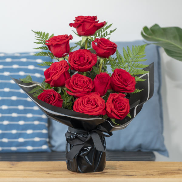 هذه الباقه تحتوي على جوري مع أوراق خضراء.