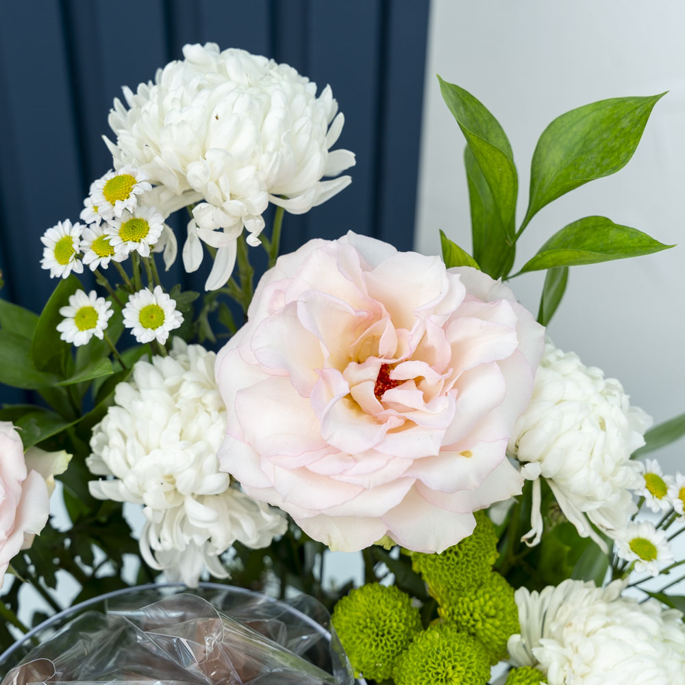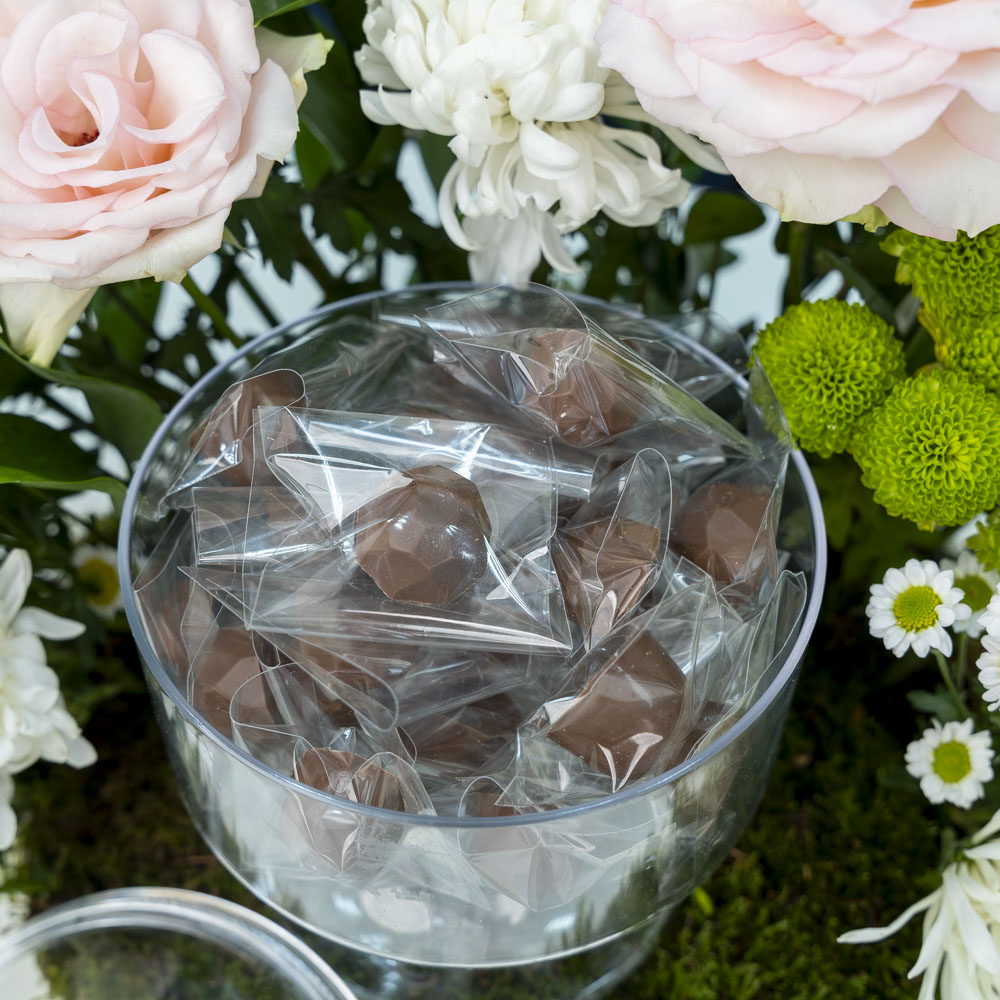 صينية تحتوي على الجوري، الكريز والاقحوان مع الشوكولاتة.