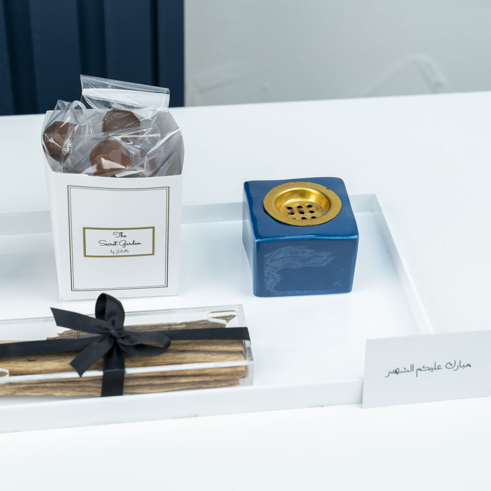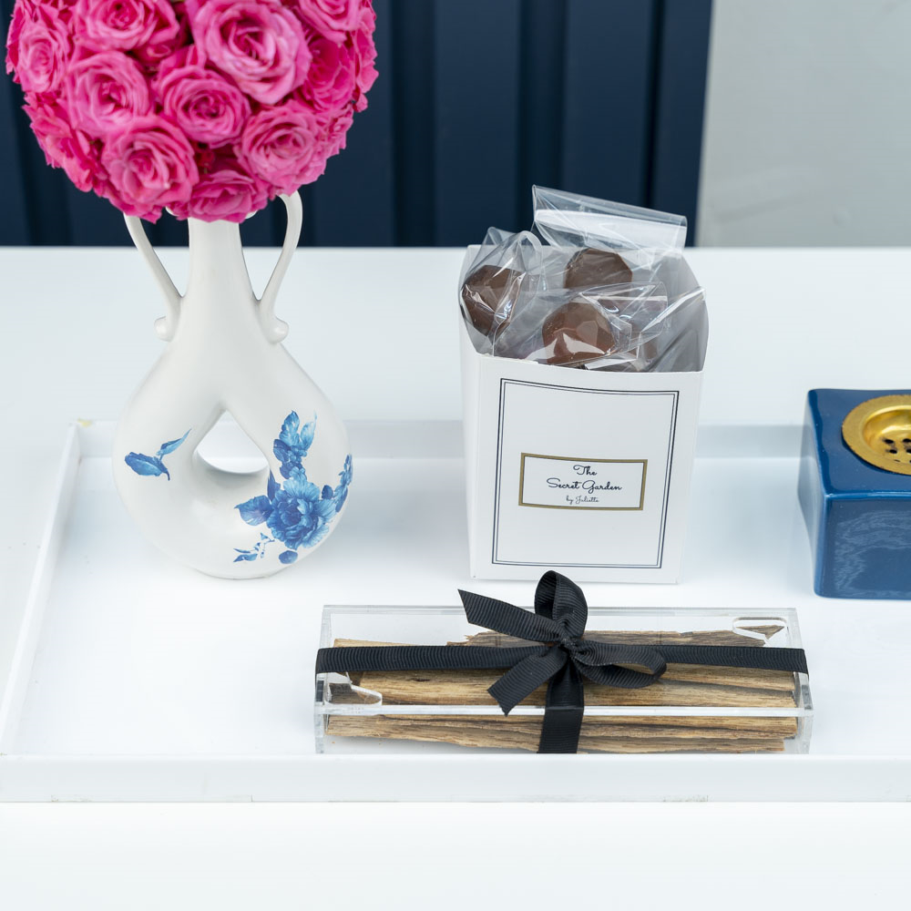 صينية من الأكريليك تحتوي على فازة مزينه بزهور البيبي روز، علبة الشوكولاتة الفاخرة، مبخر وعلبة بخور فياتنامي.