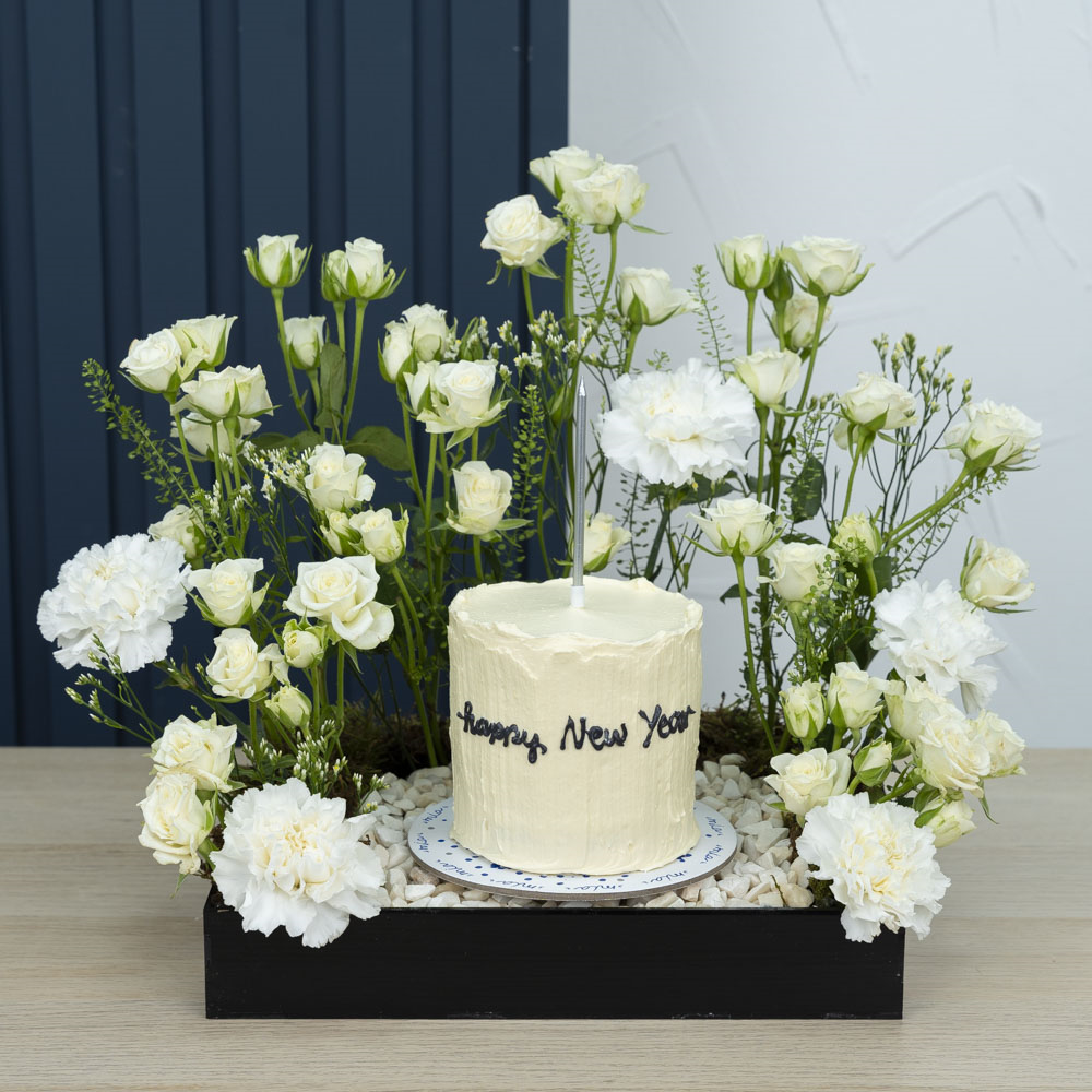 صينينة تحتوي على الجوري والكارنيشن مع كيكة الشوكولاتة.